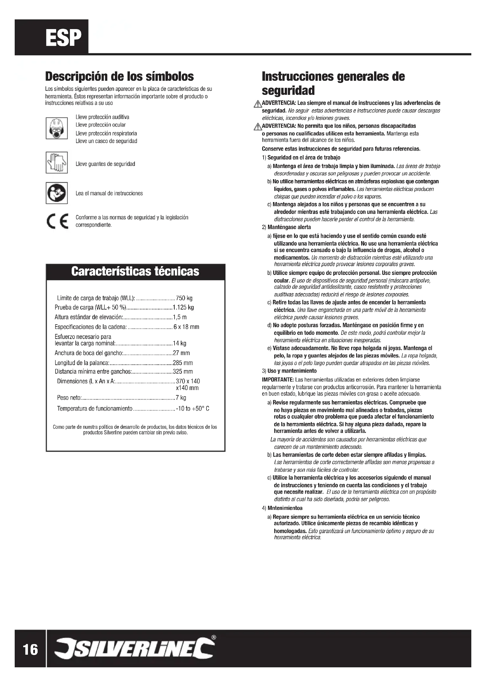 Conforme a las normas de seguridad y la legislación correspondiente. Características técnicas Límite de carga de trabajo (WLL): ..........................750 kg Prueba de carga (WLL+ 50 %)...............................1.125 kg Altura estándar de elevación: .................................1,5 m Especificaciones de la cadena: .............................. 6 x 18 mm Esfuerzo necesario para levantar la carga nominal:......................................14 kg Anchura de boca del gancho:.................................27 mm Longitud de la palanca: ..........................................285 mm Distancia mínima entre ganchos: ...........................325 mm Dimensiones (L x An x A: ........................................370 x 140 x140 mm Peso neto: ..............................................................7 kg Temperatura de funcionamiento ............................ -10 to +50° C Como parte de nuestra política de desarrollo de productos, los datos técnicos de los productos Silverline pueden cambiar sin previo aviso. 633809_Z1MANPRO1.indd 16 20/12/2013 11:09Instrucciones de seguridad para herramientas de elevación Inspeccione el equipo