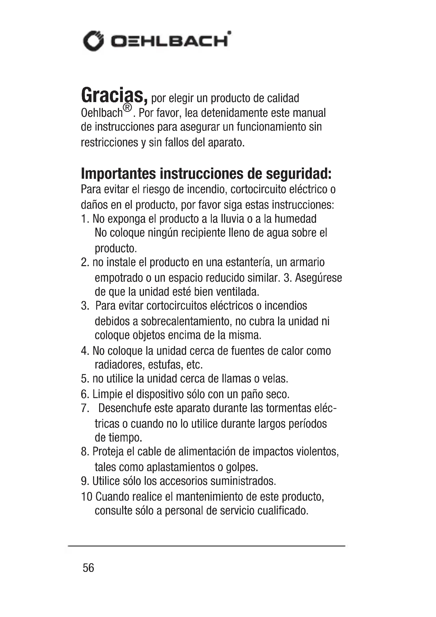 . Por favor, lea detenidamente este manual de instrucciones para asegurar un funcionamiento sin restricciones y sin fallos del aparato. Importantes instrucciones de seguridad: Para evitar el riesgo de incendio, cortocircuito eléctrico o daños en el producto, por favor siga estas instrucciones: