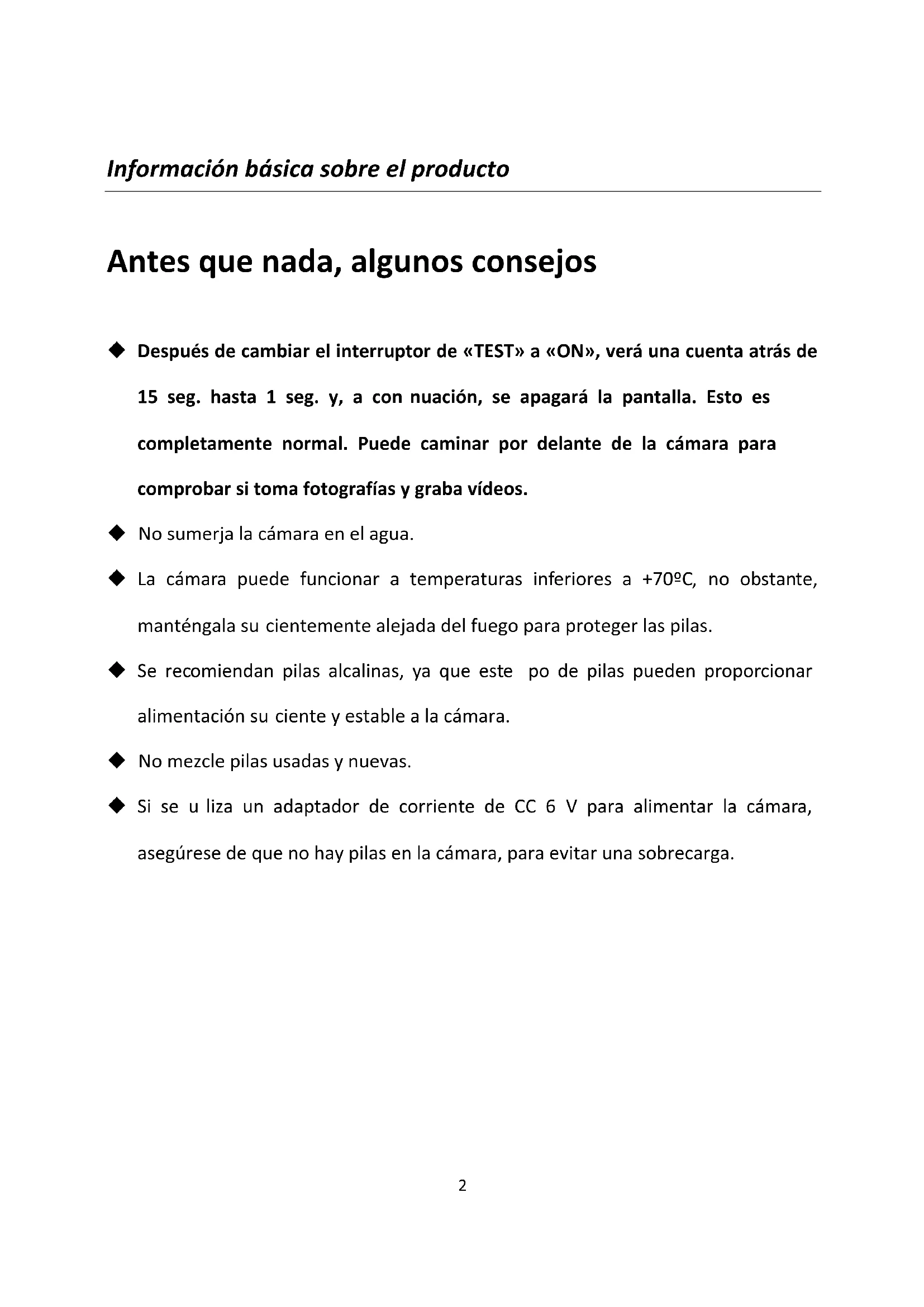 Scouting Cam BLACK550 Manual del usuario2 Información básica sobre el producto Antes que nada, algunos consejos Después de cambiar el interruptor de «TEST» a «ON», verá una cuenta atrás de 15 seg. hasta 1 seg. y, a continuación, se apagará la pantalla. Esto es completamente normal. Puede caminar por delante de la cámara para comprobar si toma fotografías y graba vídeos. No sumerja la cámara en el agua. La cámara puede funcionar a temperaturas inferiores a +70ºC, no obstante, manténgala suficientemente alejada del fuego para proteger las pilas. Se recomiendan pilas alcalinas, ya que este tipo de pilas pueden proporcionar alimentación suficiente y estable a la cámara. No mezcle pilas usadas y nuevas. Si se utiliza un adaptador de corriente de CC 6 V para alimentar la cámara, asegúrese de que no hay pilas en la cámara, para evitar una sobrecarga.3