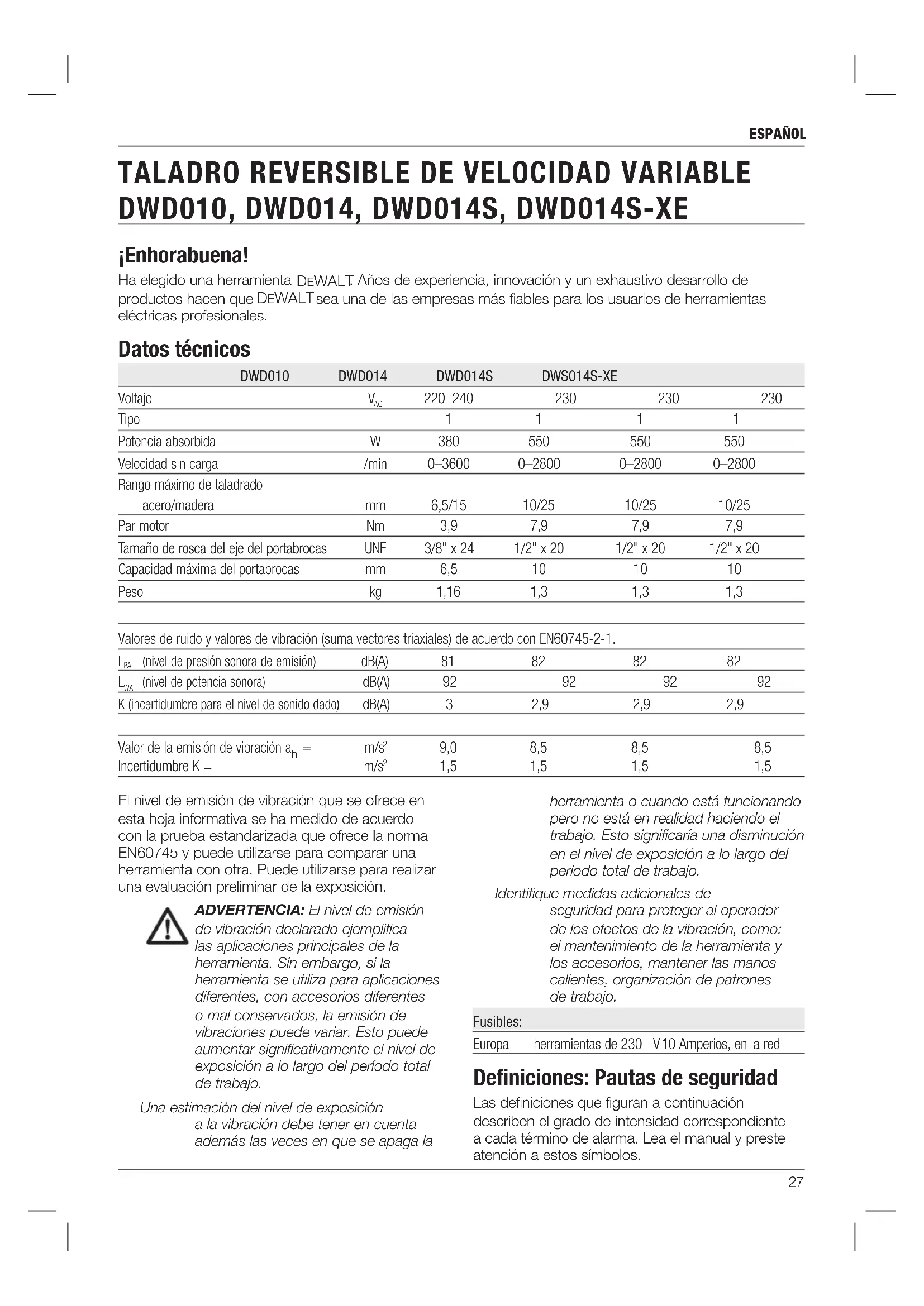 the main housing with dry air as often as dirt is seen collecting in and around the air vents. Wear approved eye protection and approved dust mask when performing this procedure.27 español El nivel de emisión de vibración que se ofrece en esta hoja informativa se ha medido de acuerdo con la prueba estandarizada que ofrece la norma EN60745 y puede utilizarse para comparar una herramienta con otra. Puede utilizarse para realizar una evaluación preliminar de la exposición. ADVERTENCIA: El nivel de emisión de vibración declarado ejemplifica las aplicaciones principales de la herramienta. Sin embargo, si la herramienta se utiliza para aplicaciones diferentes, con accesorios diferentes o mal conservados, la emisión de vibraciones puede variar. Esto puede aumentar significativamente el nivel de exposición a lo largo del período total de trabajo. Una estimación del nivel de exposición a la vibración debe tener en cuenta además las veces en que se apaga la ¡Enhorabuena! Ha elegido una herramienta DeWALT . Años de experiencia, innovación y un exhaustivo desarrollo de productos hacen que DeWALT sea una de las empresas más fiables para los usuarios de herramientas eléctricas profesionales. Datos técnicos