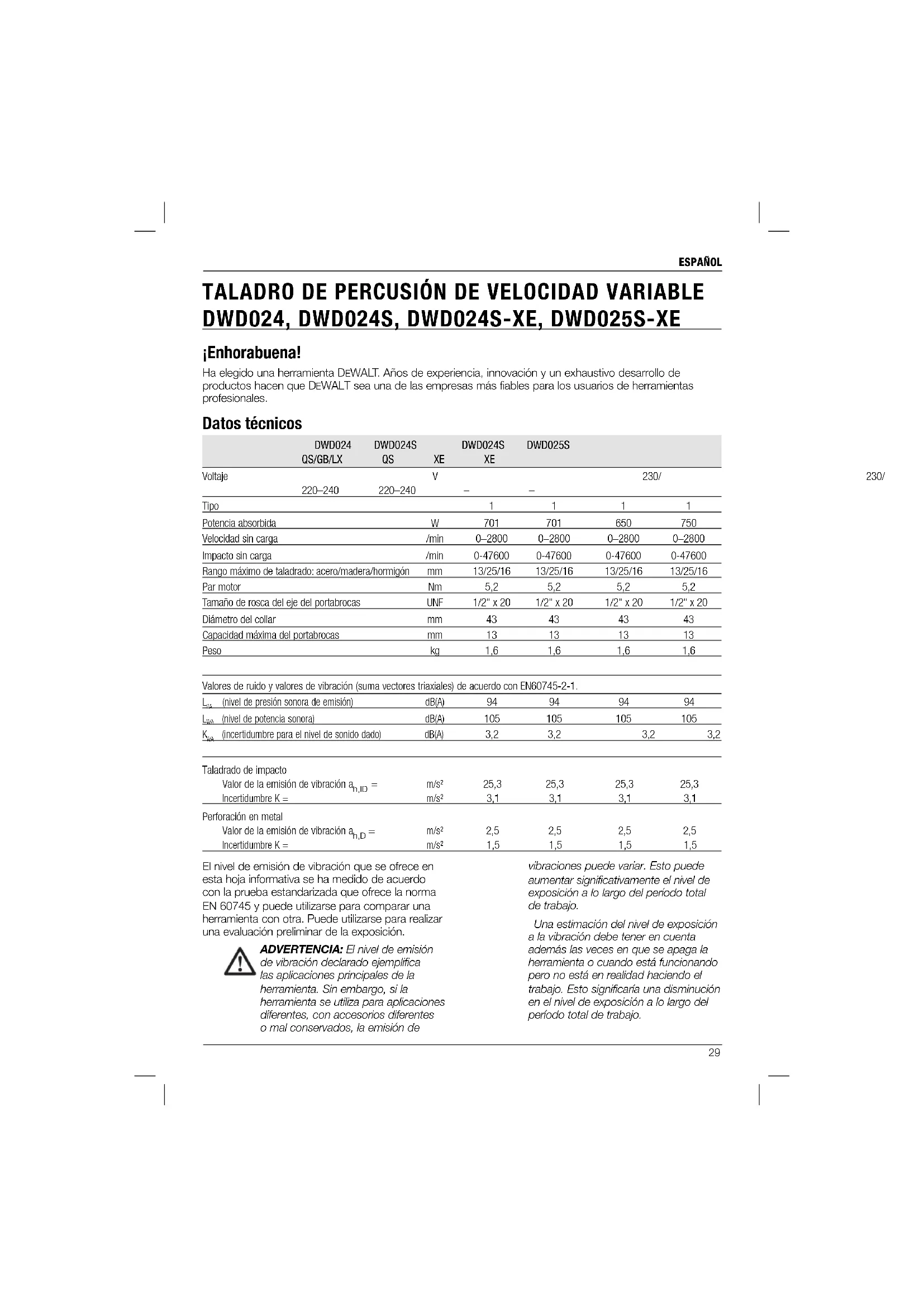 EWALT autorizados y detalles sobre nuestro servicio postventa en Internet: www.2helpU.com. Lubricación La herramienta eléctrica no requiere lubricación adicional. Limpieza ADVERTENCIA: Sople la suciedad y el polvo de la carcasa principal con aire seco siempre que vea acumularse el polvo alrededor de los respiraderos. Utilice protección ocular y mascarillas antipolvo aprobadas cuando realice este procedimiento. ADVERTENCIA: no use nunca disolventes ni otros agentes químicos agresivos para limpiar las piezas no metálicas de la herramienta. Estos agentes químicos pueden debilitar los materiales de dichas piezas. Use un trapo humedecido sólo con agua y jabón suave. No deje que penetre ningún líquido dentro de la herramienta y no sumerja ninguna pieza de la herramienta en líquidos. Accesorios opcionales ADVERTENCIA: Dado que algunos accesorios, diferentes de los ofrecidos por D EWALT, no se han probado con este producto, el empleo de tales accesorios podría constituir un riesgo. Para reducir el riesgo de lesiones, sólo deben usarse con el producto los accesorios recomendados DEWALT. ATENCIÓN: Para reducir el riesgo de lesión, deben utilizarse los accesorios sólo en los tamaños hasta los máximos mostrados en los Datos técnicos. Si desea más información sobre los accesorios adecuados, consulte a su distribuidor. Protección del medio ambiente Recogida selectiva. Este producto no se debe eliminar con la basura doméstica.38 FRANÇAIS Félicitations! Vous avez choisi un outil DEWALT. Des années d’expérience, un développement de produits approfondi et une innovation constante font de DEWALT l’un des partenaires les plus fiables pour les utilisateurs d’outils électriques professionnels. Fiche technique DWD024 DWD024S DWD024S DWD025S QS/GB/LX QS XE XE Tension V 230/ 230/ 230 230 220–240 220–240 – – Type 1 1 1 1 Puissance absorbée W 701 701 650 750 Vitesse à vide /min 0–2800 0–2800 0–2800 0–2800 Impact à vide /min 0–47600 0–47600 0–47600 0–47600 Plage de perçage maximale: acier/bois/béton mm 13/25/16 13/25/16 13/25/16 13/25/16 Couple Nm 5,2 5,2 5,2 5,2 Diamètre nominal de broche de mandrin UNF 1/2" x 20 1/2" x 20 1/2" x 20 1/2" x 20 Diamètre de bague mm 43 43 43 43 Capacité maximale de mandrin mm 13 13 13 13 Poids kg 1,6 1,6 1,6 1,6 Valeurs acoustiques et valeurs vibratoires (somme vectorielle triax) selon EN60745-2-1.