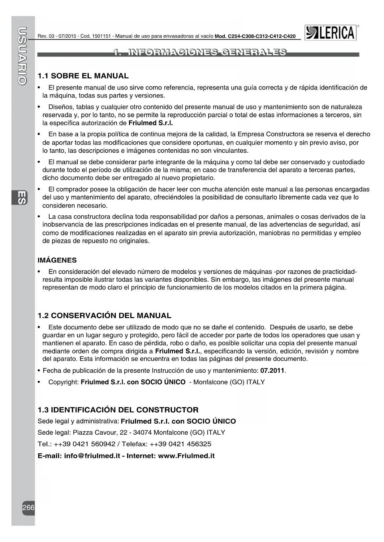 USUARIO Rev. 03 - 07/2015 - Cod. 1501151 - Manual de uso para envasadoras al vacío Mod. C254-C308-C312-C412-C420 Elaparatoseidenticamedianteunaplacaubicadadelladoposterior,enlaqueseespecicanlossiguientesdatos: Modelo. Tensiónynúmerofases(Voltios). Frecuencia (Hertzios). Potenciamáximaabsorbida(Watts) Peso. Año de construcción. Número de matrícula.