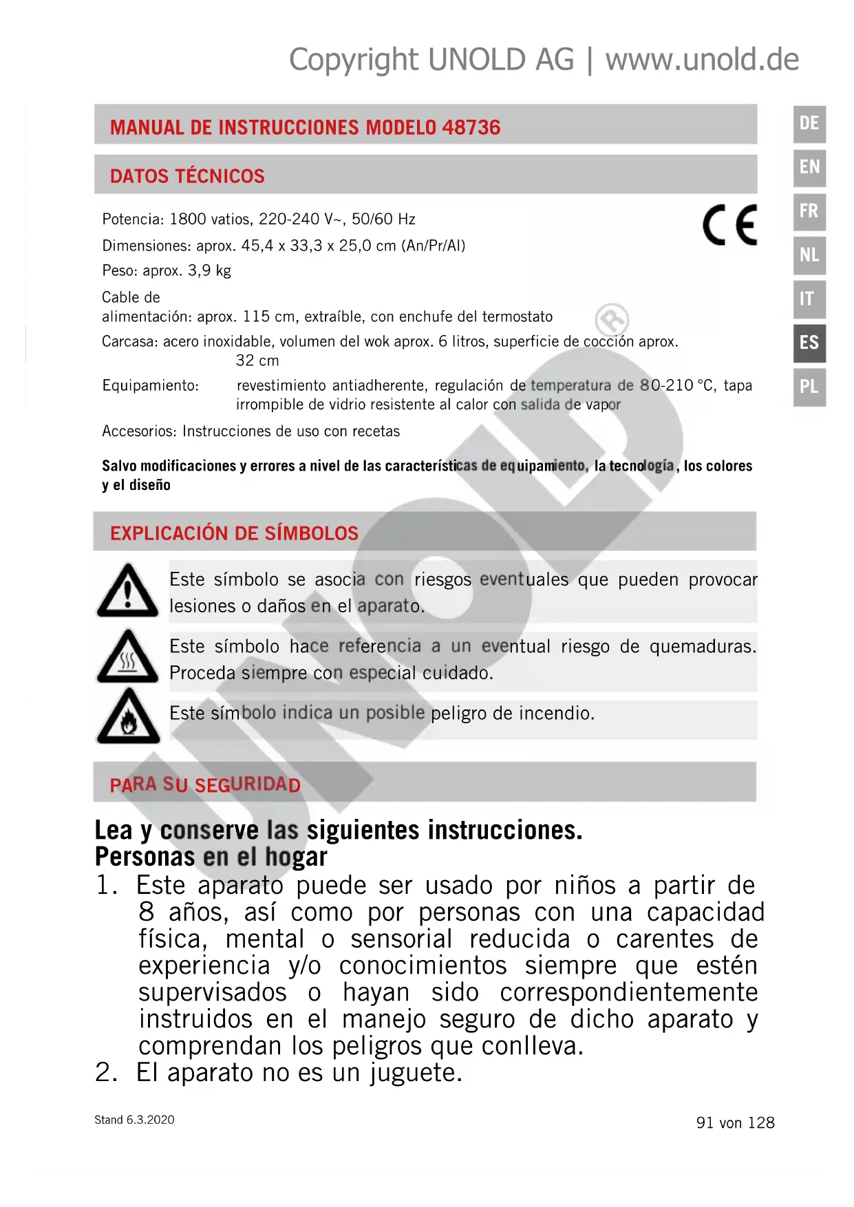 La garantía para nuestros equipos es de 24 meses, y de 12 meses en el caso de uso comercial, a partir de la fecha de compra, cubriendo los daños que con un uso acorde a lo prescrito pueden atribuirse fehacientemente a defectos de fabricación. Dentro del período de garantía, solucionamos errores de material y de fabricación a consideración nuestra mediante reparación o cambio. Nuestros servicios de garantía son válidos únicamente para los aparatos que han sido vendidos en Alemania y Austria. Para todos los demás casos diríjase por favor al importador correspondiente. Aquellos aparatos que se presentan para eliminar errores, por favor enviarlos junto a una copia del comprobante de compra extendido a máquina, del cual debe desprenderse la fecha de compra, así como una breve descripción de las deficiencias, apropiadamente embalado a nuestro servicio al cliente. Puede imprimir un comprobante de devolución en nuestro sitio web www.unold.de/ruecksendung. (solo para entradas de Alemania y Austria). Aquellos daños causados por desgaste están excluidos de la garantía, así como manipulación incorrecta, e incumplimiento de las condiciones de mantenimiento y cuidado. El derecho a garantía expira si las reparaciones o mantenimiento son realizadas por terceros. Todo reclamo del consumidor final ante el vendedor, comerciante no se ve afectado por esta garantía. DISPOSICIÓN/PROTECCIÓN DEL MEDIO AMBIENTE Nuestros aparatos se fabrican con un alto nivel de calidad por un largo período de uso. El mantenimiento regular y las reparaciones de tipo técnico a través de nuestro servicio al cliente pueden prolongar la duración del aparato. Cuando un aparato está defectuoso y ya no puede repararse, por favor considere en la disposición final los siguientes puntos: Este producto no puede ser eliminado junto a la basura domiciliaria. Usted debe entregar este producto a un lu- gar oficial para el reciclaje de aparatos eléctricos o electrónicos. Mediante la clasificación por separado y el reciclaje de productos residuales, Usted contribuye a proteger los recursos natu- rales y asegura que el producto sea eliminado de forma salubre y acorde con el medio ambiente. Copyright UNOLD AG | www.unold.de108 von 128Stand 6.3.2020