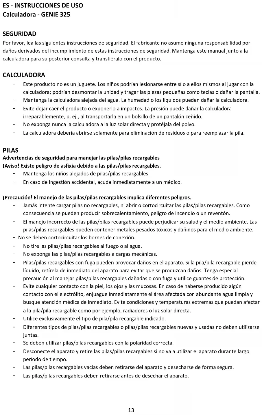 Calculadora - GENIE 325 SEGURIDAD Por favor, lea las siguientes instrucciones de seguridad. El fabricante no asume ninguna responsabilidad por daños derivados del incumplimiento de estas instrucciones de seguridad. Mantenga este manual junto a la calculadora para su posterior consulta y transfiéralo con el producto. CALCULADORA - Este producto no es un juguete. Los niños podrían lesionarse entre sí o a ellos mismos al jugar con la calculadora; podrían desmontar la unidad y tragar las piezas pequeñas como teclas o dañar la pantalla. - Mantenga la calculadora alejada del agua. La humedad o los líquidos pueden dañar la calculadora. - Evite dejar caer el producto o exponerlo a impactos. La presión puede dañar la calculadora irreparablemente, p. ej., al transportarla en un bolsillo de un pantalón ceñido. - No exponga nunca la calculadora a la luz solar directa y protéjala del polvo. - La calculadora debería abrirse solamente para eliminación de residuos o para reemplazar la pila.