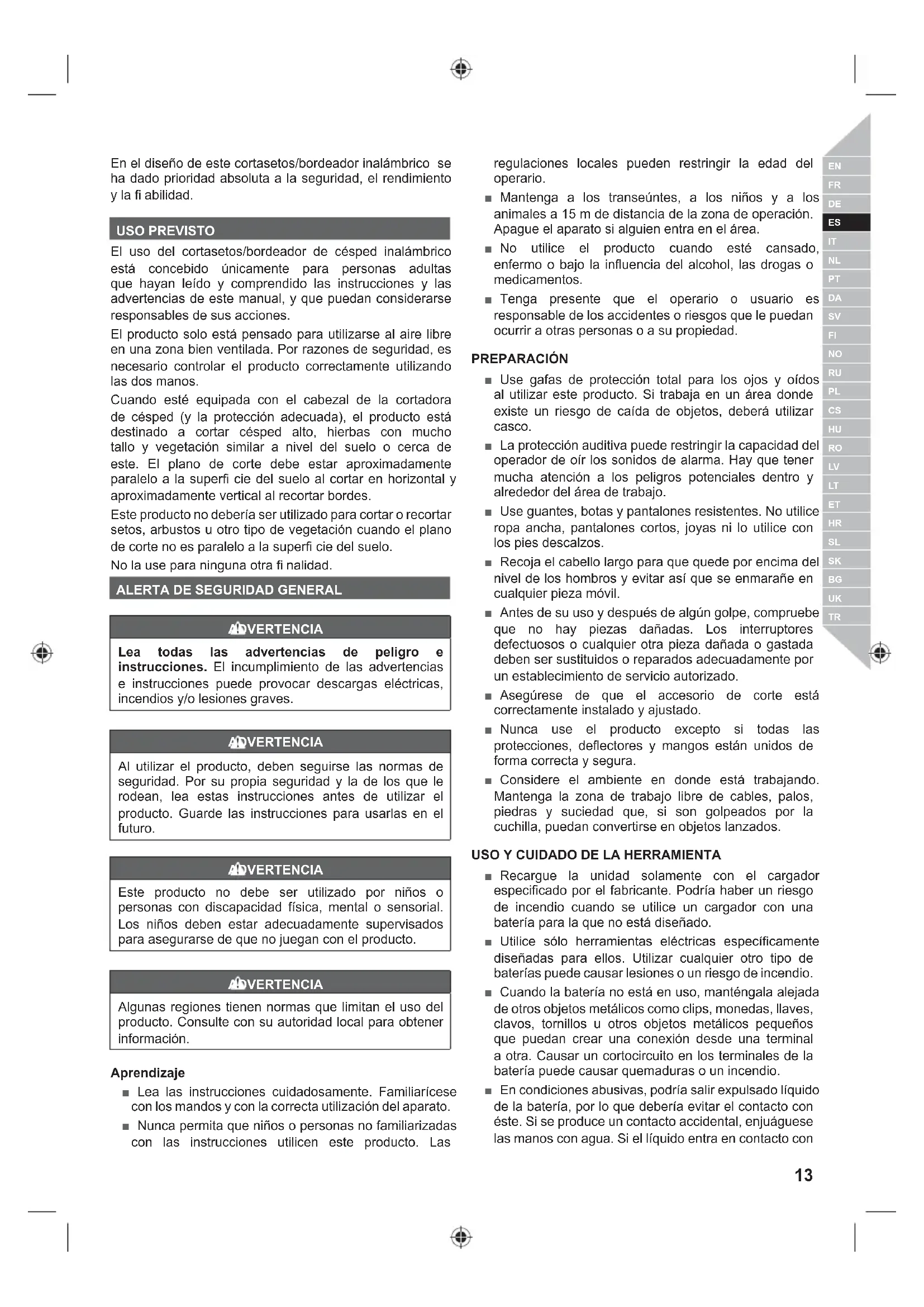 CORTASETOS/BORDEADOR ■ Nunca deje que utilicen este aparato niños, personas con capacidad física, sensorial o mental reducida, personas sin experiencia ni conocimientos ni personas que no estén familiarizadas con estas instrucciones. ■ Use el producto de día o bajo luz artificial bien iluminada. ■ Evite el uso en hierba mojada. ■ Manténganse bien apoyado y equilibrado en todas las circunstancias, especialmente en cuestas. ■ No camine hacia atrás mientras use este producto. ■ Camine, nunca corra. ■ Mantenga el accesorio de corte por debajo del nivel de la cintura. ■ No utilice el producto con las cubiertas dañadas o sin tenerlas colocadas. ■ Nunca adapte una línea de reemplazo de metal. ■ Mantenga las manos y los pies lejos de los medios cortantes en todo momento y especialmente cuando encienda el motor. ■ Tenga cuidado. Los elementos de corte siguen rotando después de apagar el motor. ■ Tenga cuidado con los objetos lanzados por el medio de corte. Limpie la suciedad como pequeñas piedras, gravilla y otros objetos extraños de la zona de trabajo antes de empezar a operar. Los alambres o las cuerdas pueden enredarse en las líneas de corte. ■ Apague y retire la batería antes de: ● mantenimiento ● dejar el producto desatendido ● limpieza del producto ● cambiar accesorios ● comprobar si hay daños después de golpear un objeto ● comprobar si hay daños en caso de que el producto empiece a vibrar de un modo anormal ● realizar operaciones de mantenimiento ■ Use gafas de protección total para los ojos y oídos al utilizar este producto. Si trabaja en un área donde existe un riesgo de caída de objetos, deberá utilizar casco. ■ La protección auditiva puede restringir la capacidad del operador de oír los sonidos de alarma. Hay que tener mucha atención a los peligros potenciales dentro y alrededor del área de trabajo. ■ Use guantes, botas y pantalones resistentes. No utilice ropa ancha, pantalones cortos, joyas ni lo utilice con los pies descalzos. ■ Recoja el cabello largo para que quede por encima del nivel de los hombros y evitar así que se enmarañe en cualquier pieza móvil. ■ La cuchilla pequeña fijada en la protección de seguridad está diseñada para cortar la nueva línea extendida en la longitud correcta, para un rendimiento óptimo y seguro. Es muy afilada. No la toque, especialmente cuando limpie el producto. ■ Asegúrese siempre de que las aberturas de ventilación estén libres de residuos. ■ Antes de su uso y después de algún golpe, compruebe que no hay piezas dañadas. Los interruptores defectuosos o cualquier otra pieza dañada o gastada deben ser sustituidos o reparados adecuadamente por un establecimiento de servicio autorizado. ■ Asegúrese de que el accesorio de corte está correctamente instalado y ajustado. ■ Asegúrese de que todas las protecciones, deflectores y mangos están unidos de forma correcta y segura. ■ No modifique, de ninguna manera, el producto, ya que puede aumentar el riesgo de lesionarse usted o de lesionar a los demás. ■ Utilice sólo el hilo de corte de recambio del fabricante. No utilice ningún tipo de pieza cortante. ■ Apague inmediatamente el aparato y retire la batería en el caso de accidente o avería. No vuelva a utilizar el producto hasta que un servicio de mantenimiento autorizado lo haya inspeccionado completamente. ADVERTENCIA Asegúrese de que la línea de la cuchilla de corte en la protección esté correctamente colocada y asegurada antes de cada uso.
