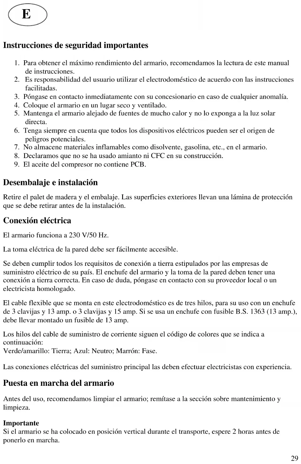 Desembalaje e instalación Retire el palet de madera y el embalaje. Las superficies exteriores llevan una lámina de protección que se debe retirar antes de la instalación. Conexión eléctrica El armario funciona a 230 V/50 Hz. La toma eléctrica de la pared debe ser fácilmente accesible. Se deben cumplir todos los requisitos de conexión a tierra estipulados por las empresas de suministro eléctrico de su país. El enchufe del armario y la toma de la pared deben tener una conexión a tierra correcta. En caso de duda, póngase en contacto con su proveedor local o un electricista homologado. El cable flexible que se monta en este electrodoméstico es de tres hilos, para su uso con un enchufe de 3 clavijas y 13 amp. o 3 clavijas y 15 amp. Si se usa un enchufe con fusible B.S. 1363 (13 amp.), debe llevar montado un fusible de 13 amp. Los hilos del cable de suministro de corriente siguen el código de colores que se indica a continuación: Verde/amarillo: Tierra; Azul: Neutro; Marrón: Fase. Las conexiones eléctricas del suministro principal las deben efectuar electricistas con experiencia. Puesta en marcha del armario Antes del uso, recomendamos limpiar el armario; remítase a la sección sobre mantenimiento y limpieza. Importante Si el armario se ha colocado en posición vertical durante el transporte, espere 2 horas antes de ponerlo en marcha. E30