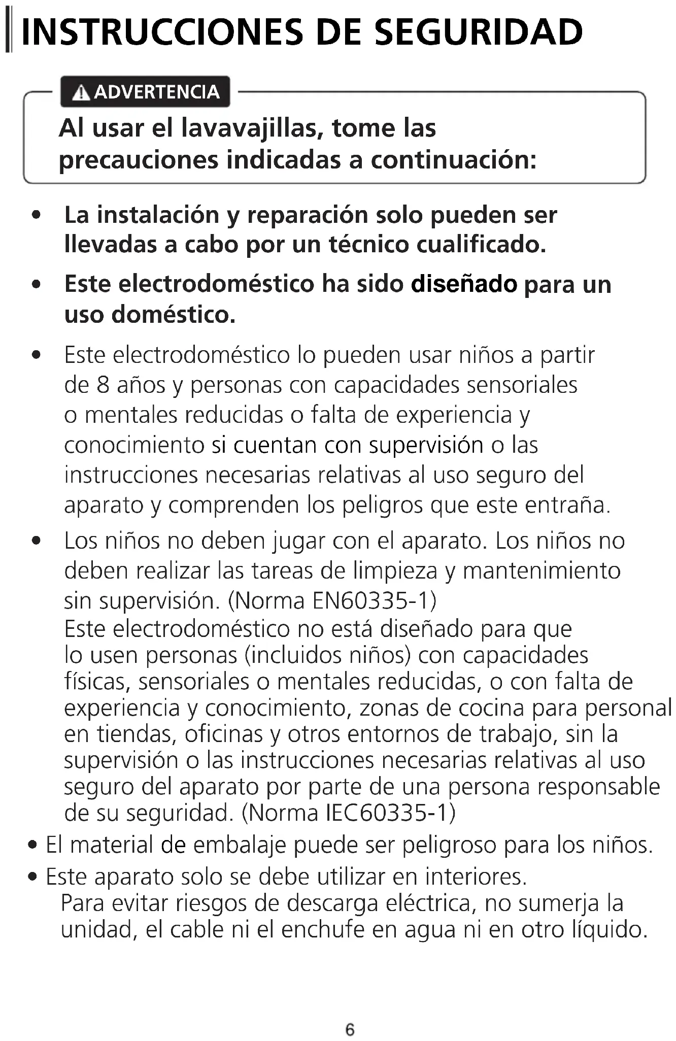 Este electrodoméstico no está diseñado para que lo usen personas (incluidos niños) con capacidades físicas, sensoriales o mentales reducidas, o con falta de experiencia y conocimiento, zonas de cocina para personal en tiendas, oficinas y otros entornos de trabajo, sin la supervisión o las instrucciones necesarias relativas al uso seguro del aparato por parte de una persona responsable de su seguridad. (Norma IEC60335-1)