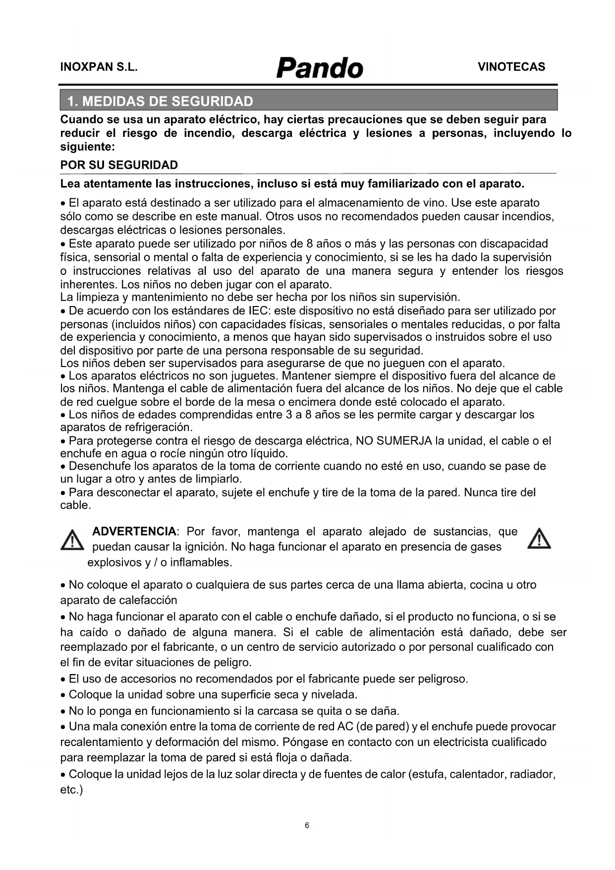ADVERTENCIA: Este aparato está libre de gases CFC y HFC y contiene pequeñas cantidades de isobutano (R600a), que es respetuoso con el medio ambiente, pero inflamable. No daña la capa de ozono, ni va a incrementar el efecto invernadero. Se debe tener cuidado durante el transporte y puesta en marcha de la máquina de que no haya partes del sistema de refrigeración estén dañadas. Las fugas de refrigerante pueden inflamarse y pueden dañar los ojos. En el caso de daños: - Evitar llamas abiertas y todo lo que cree una chispa - Desconectar de la red eléctrica - Airear la habitación en la que el aparato se encuentra durante varios minutos y póngase en contacto con el Servicio de Asistencia Técnica para asesoramiento. En el caso de fuga de refrigerante, si el aparato se encuentra en una pequeña habitación, existe el peligro de que los gases combustibles se esparcen por la habitación. Por cada 8 g de refrigerante se requiere al menos 1 metro cúbico de espacio de la habitación. La cantidad de refrigerante en el aparato está indicada en la placa de datos del interior del aparato. Es peligroso para cualquier persona que no sea un servicio técnico autorizado llevar a cabo el mantenimiento o reparación de este aparato. ADVERTENCIA: Mantenga las aberturas de ventilación, en el aparato o de la estructura integrada, sin obstáculos. No se aceptará responsabilidad alguna por cualquier daño que haya incurrido debido al mal uso del aparato o como resultado de las reparaciones efectuadas por personal no cualificado. En este caso no será válida ni la garantía ni cualquier otra reclamación de responsabilidad. ADVERTENCIA: No utilice dispositivos mecánicos u otros medios para acelerar el proceso de descongelación que no sean los recomendados por el fabricante. ADVERTENCIA: No dañe el circuito refrigerante. Nunca utilice un aparato con un circuito dañado. ADVERTENCIA: No utilice ningún aparato eléctrico en el interior del compartimento de alimentos del aparato, a menos que sean del tipo recomendado por el fabricante. ADVERTENCIA: Para evitar el peligro debido a la inestabilidad del aparato, ha de fijarse de acuerdo con las instrucciones. PRECAUCIÓN: Por favor, mantenga los productos lejos del fuego o sustancias abrasivas, antes de instalar el refrigerador. ADVERTENCIA: NO almacene sustancias explosivas como latas de aerosol con un propelente inflamable en este aparato. ADVERTENCIA: cuando instale el aparato, asegúrese de que el cable de alimentación no quede atrapado o dañado. ADVERTENCIA: No ubique enchufes portátiles, alargos o fuentes de alimentación portátiles en la parte posterior de la unidad.INOXPAN S.L. VINOTECAS