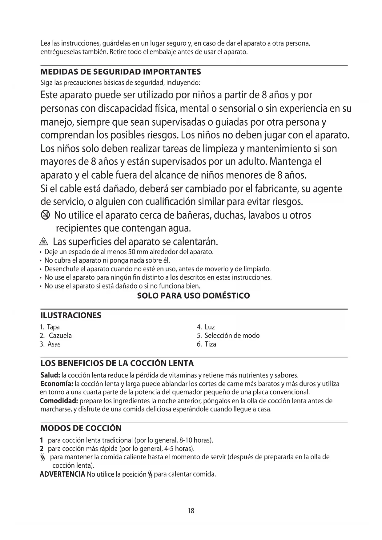 Este aparato pueda ser utilisé por niños a partir de 8 años y por personas con discapacidad fisica, mental o sensorial o sin experiencia en su manejo, siempre que Sean supervisas o guiadas por otra persona y comprendan los posibles riesgos. Los niños no deben hacer jugar con el aparato. Los niños solo deben realizar tareas de limpieza y mantenimiento si son mayores de 8 años y está supervisas por unadulto. Mantenga el aparato y el cable fuera del alcance de niños menosores de 8 años. Si el cable está dañado, deben ser换成 por el fabricante, su agente de servicios, o alguien con calidad similar paraatarr riesgos.