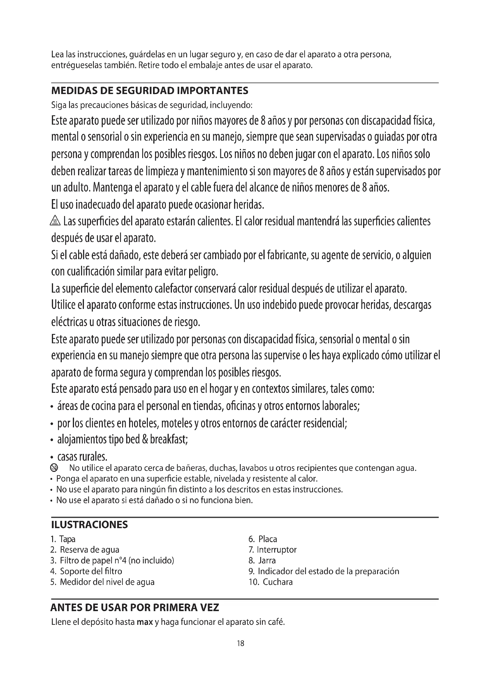 Siga las precauciones básicas de seguridad, incluyendo: Este aparato puede ser utilizado por niños mayores de 8 años y por personas con discapacidad física, mental o sensorial o sin experiencia en su manejo, siempre que sean supervisadas o guiadas por otra persona y comprendan los posibles riesgos. Los niños no deben jugar con el aparato. Los niños solo deben realizar tareas de limpieza y mantenimiento si son mayores de 8 años y están supervisados por un adulto. Mantenga el aparato y el cable fuera del alcance de niños menores de 8 años. El uso inadecuado del aparato puede ocasionar heridas. h Las superficies del aparato estarán calientes. El calor residual mantendrá las superficies calientes después de usar el aparato. Si el cable está dañado, este deberá ser cambiado por el fabricante, su agente de servicio, o alguien con cualificación similar para evitar peligro. La superficie del elemento calefactor conservará calor residual después de utilizar el aparato. Utilice el aparato conforme estas instrucciones. Un uso indebido puede provocar heridas, descargas eléctricas u otras situaciones de riesgo. Este aparato puede ser utilizado por personas con discapacidad física, sensorial o mental o sin experiencia en su manejo siempre que otra persona las supervise o les haya explicado cómo utilizar el aparato de forma segura y comprendan los posibles riesgos. Este aparato está pensado para uso en el hogar y en contextos similares, tales como: