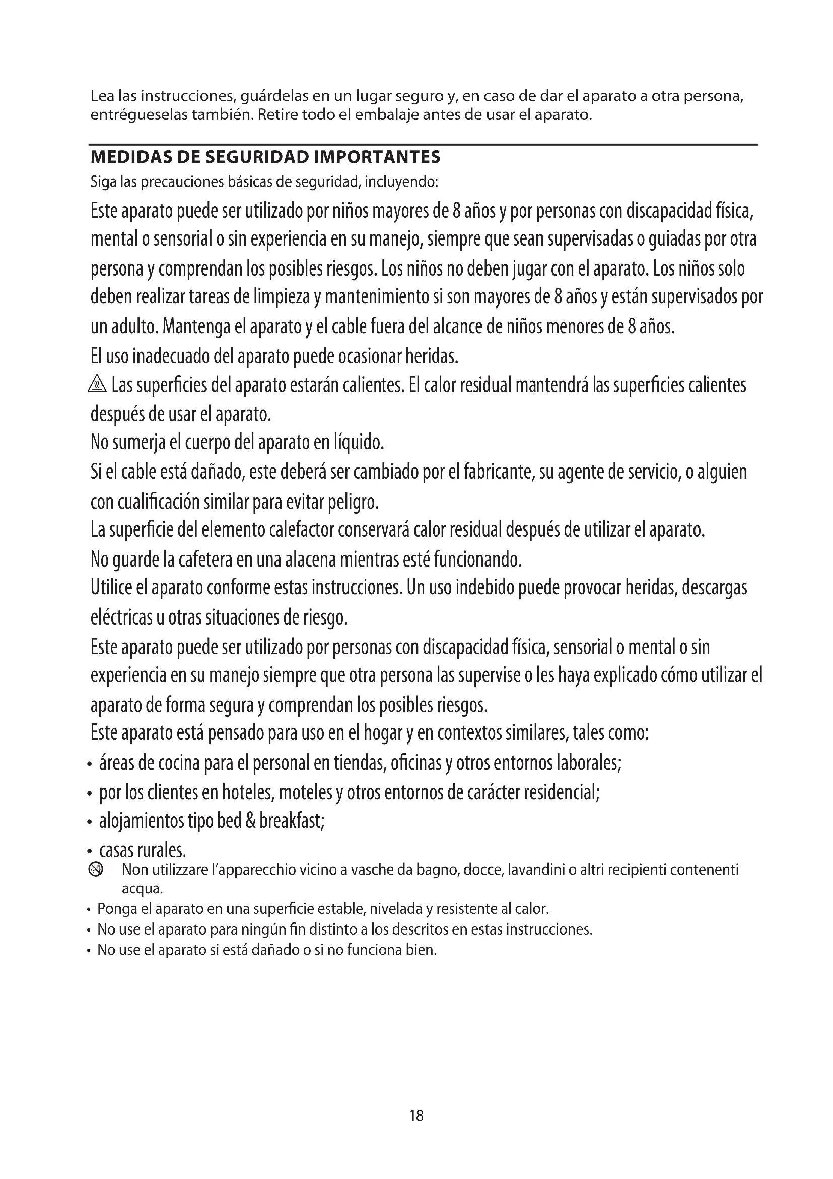 Siga las precauciones básicas de seguridad, incluyendo: Este aparato puede ser utilizado por niños mayores de 8 años y por personas con discapacidad física, mental o sensorial o sin experiencia en su manejo, siempre que sean supervisadas o guiadas por otra persona y comprendan los posibles riesgos. Los niños no deben jugar con el aparato. Los niños solo deben realizar tareas de limpieza y mantenimiento si son mayores de 8 años y están supervisados por un adulto. Mantenga el aparato y el cable fuera del alcance de niños menores de 8 años. El uso inadecuado del aparato puede ocasionar heridas. h Las supercies del aparato estarán calientes. El calor residual mantendrá las supercies calientes después de usar el aparato. No sumerja el cuerpo del aparato en líquido. Si el cable está dañado, este deberá ser cambiado por el fabricante, su agente de servicio, o alguien con cualicación similar para evitar peligro. La supercie del elemento calefactor conservará calor residual después de utilizar el aparato. No guarde la cafetera en una alacena mientras esté funcionando. Utilice el aparato conforme estas instrucciones. Un uso indebido puede provocar heridas, descargas eléctricas u otras situaciones de riesgo. Este aparato puede ser utilizado por personas con discapacidad física, sensorial o mental o sin experiencia en su manejo siempre que otra persona las supervise o les haya explicado cómo utilizar el aparato de forma segura y comprendan los posibles riesgos. Este aparato está pensado para uso en el hogar y en contextos similares, tales como: