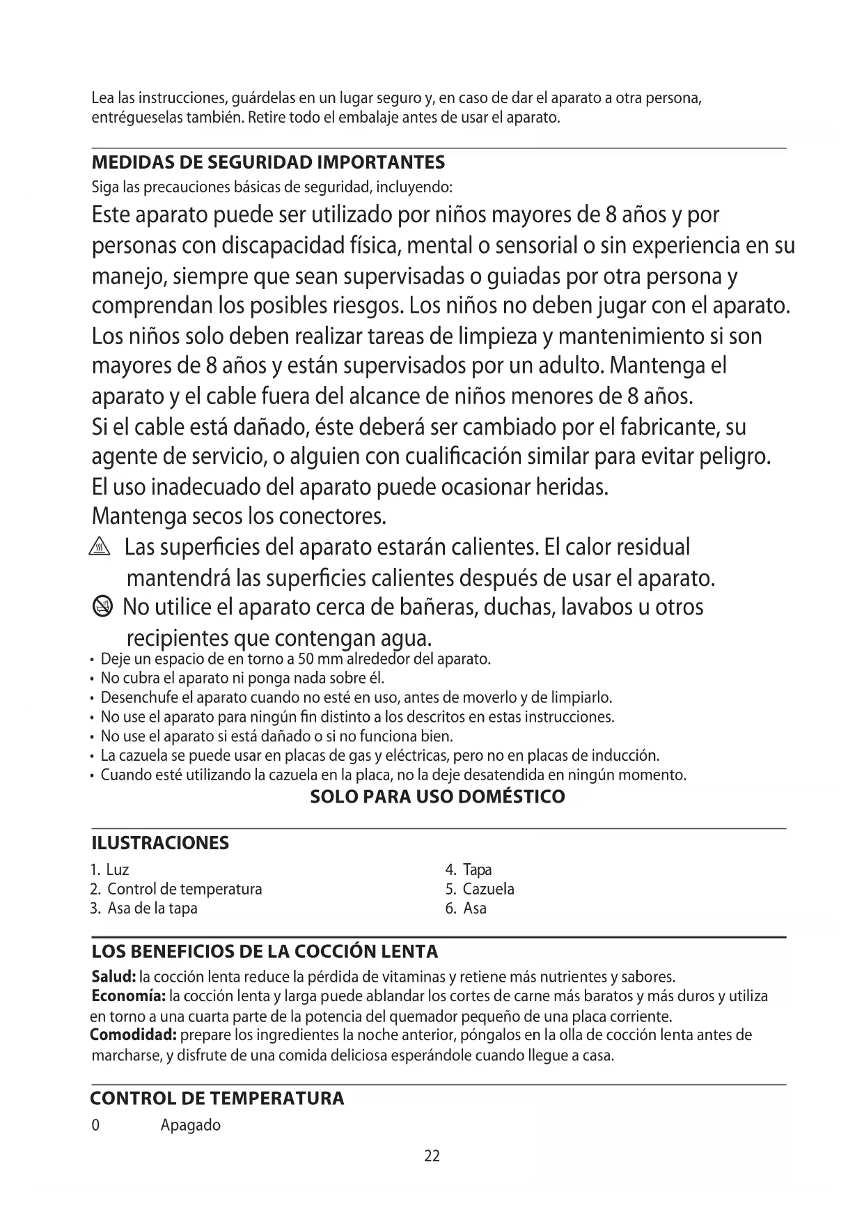 Siga las precauciones básicas de seguridad, incluyendo: Este aparato puede ser utilizado por niños mayores de 8 años y por personas con discapacidad física, mental o sensorial o sin experiencia en su manejo, siempre que sean supervisadas o guiadas por otra persona y comprendan los posibles riesgos. Los niños no deben jugar con el aparato. Los niños solo deben realizar tareas de limpieza y mantenimiento si son mayores de 8 años y están supervisados por un adulto. Mantenga el aparato y el cable fuera del alcance de niños menores de 8 años. Si el cable está dañado, éste deberá ser cambiado por el fabricante, su agente de servicio, o alguien con cualificación similar para evitar peligro. El uso inadecuado del aparato puede ocasionar heridas. Mantenga secos los conectores.