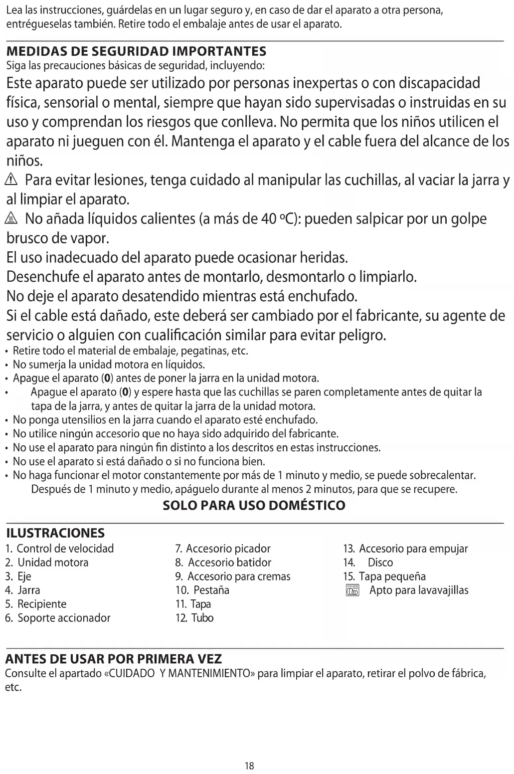 Siga las precauciones básicas de seguridad, incluyendo: Este aparato puede ser utilizado por personas inexpertas o con discapacidad física, sensorial o mental, siempre que hayan sido supervisadas o instruidas en su uso y comprendan los riesgos que conlleva. No permita que los niños utilicen el aparato ni jueguen con él. Mantenga el aparato y el cable fuera del alcance de los niños. c Para evitar lesiones, tenga cuidado al manipular las cuchillas, al vaciar la jarra y al limpiar el aparato. h No añada líquidos calientes (a más de 40 ºC): pueden salpicar por un golpe brusco de vapor. El uso inadecuado del aparato puede ocasionar heridas. Desenchufe el aparato antes de montarlo, desmontarlo o limpiarlo. No deje el aparato desatendido mientras está enchufado. Si el cable está dañado, este deberá ser cambiado por el fabricante, su agente de servicio o alguien con cualicación similar para evitar peligro.