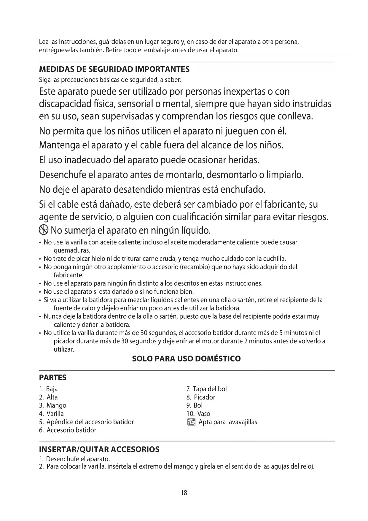 Siga las precauciones básicas de seguridad, a saber: Este aparato puede ser utilizado por personas inexpertas o con discapacidad física, sensorial o mental, siempre que hayan sido instruidas en su uso, sean supervisadas y comprendan los riesgos que conlleva. No permita que los niños utilicen el aparato ni jueguen con él. Mantenga el aparato y el cable fuera del alcance de los niños. El uso inadecuado del aparato puede ocasionar heridas. Desenchufe el aparato antes de montarlo, desmontarlo o limpiarlo. No deje el aparato desatendido mientras está enchufado. Si el cable está dañado, este deberá ser cambiado por el fabricante, su agente de servicio, o alguien con cualificación similar para evitar riesgos. i No sumerja el aparato en ningún líquido.
