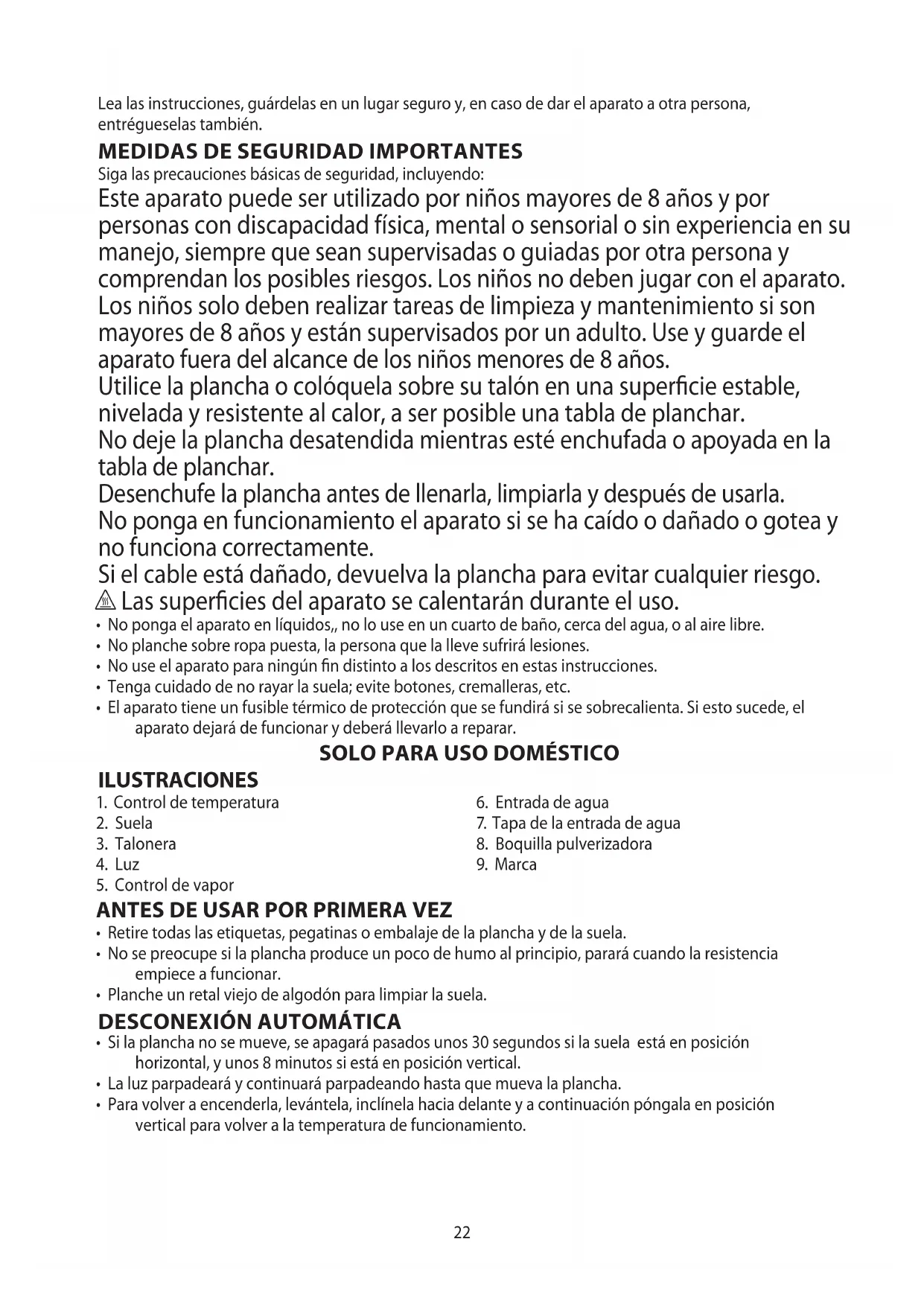 Siga las precauciones básicas de seguridad, incluyendo: Este aparato puede ser utilizado por niños mayores de 8 años y por personas con discapacidad física, mental o sensorial o sin experiencia en su manejo, siempre que sean supervisadas o guiadas por otra persona y comprendan los posibles riesgos. Los niños no deben jugar con el aparato. Los niños solo deben realizar tareas de limpieza y mantenimiento si son mayores de 8 años y están supervisados por un adulto. Use y guarde el aparato fuera del alcance de los niños menores de 8 años. Utilice la plancha o colóquela sobre su talón en una superficie estable, nivelada y resistente al calor, a ser posible una tabla de planchar. No deje la plancha desatendida mientras esté enchufada o apoyada en la tabla de planchar. Desenchufe la plancha antes de llenarla, limpiarla y después de usarla. No ponga en funcionamiento el aparato si se ha caído o dañado o gotea y no funciona correctamente. Si el cable está dañado, devuelva la plancha para evitar cualquier riesgo. h Las superficies del aparato se calentarán durante el uso.