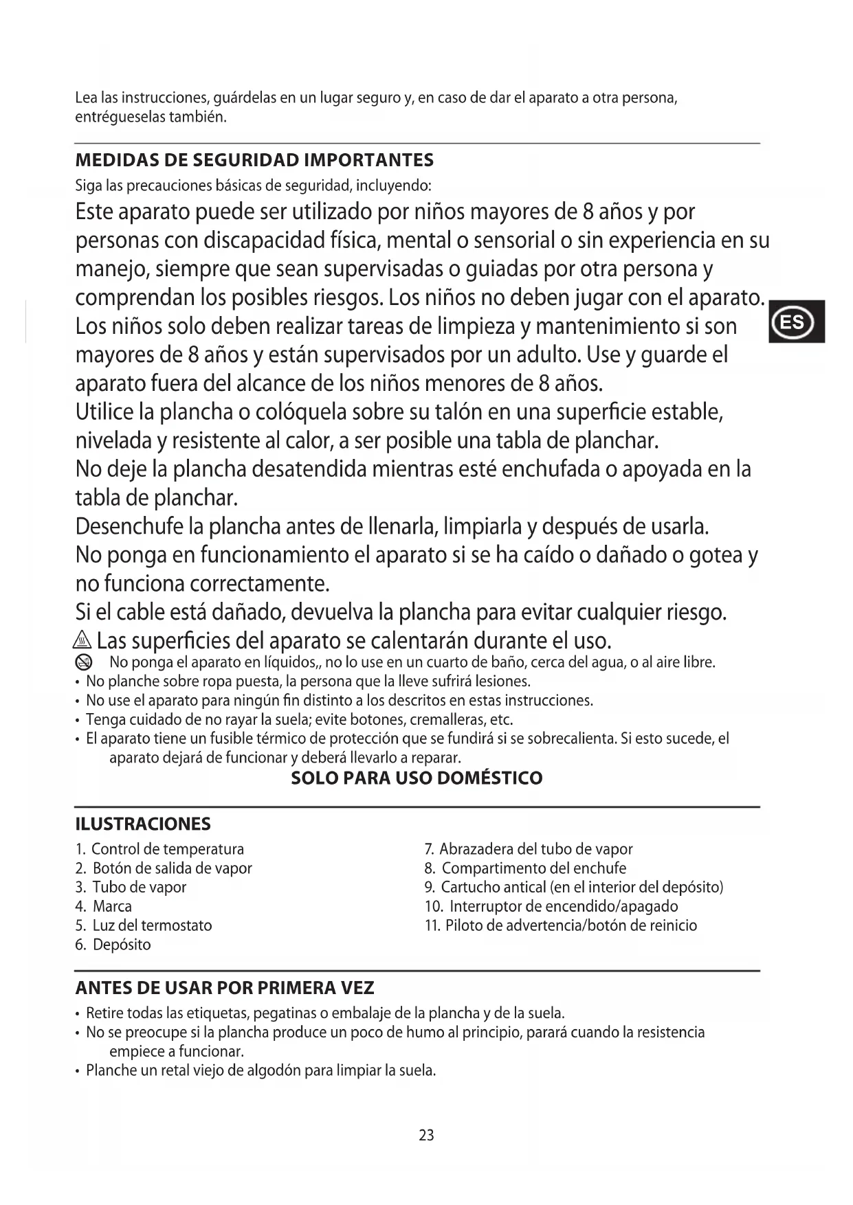 Siga las precauciones básicas de seguridad, incluyendo: Este aparato puede ser utilizado por niños mayores de 8 años y por personas con discapacidad física, mental o sensorial o sin experiencia en su manejo, siempre que sean supervisadas o guiadas por otra persona y comprendan los posibles riesgos. Los niños no deben jugar con el aparato. Los niños solo deben realizar tareas de limpieza y mantenimiento si son mayores de 8 años y están supervisados por un adulto. Use y guarde el aparato fuera del alcance de los niños menores de 8 años. Utilice la plancha o colóquela sobre su talón en una supercie estable, nivelada y resistente al calor, a ser posible una tabla de planchar. No deje la plancha desatendida mientras esté enchufada o apoyada en la tabla de planchar. Desenchufe la plancha antes de llenarla, limpiarla y después de usarla. No ponga en funcionamiento el aparato si se ha caído o dañado o gotea y no funciona correctamente. Si el cable está dañado, devuelva la plancha para evitar cualquier riesgo. h Las supercies del aparato se calentarán durante el uso.