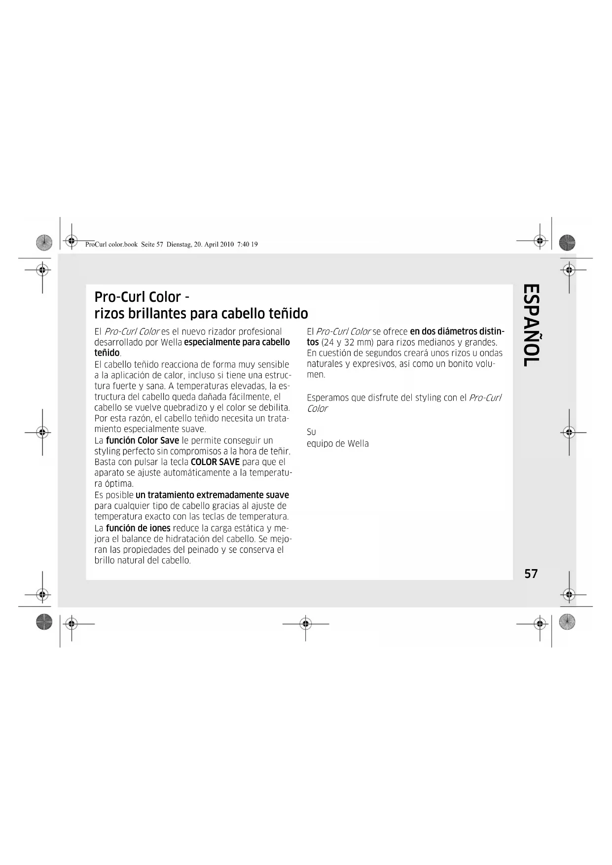 1 Lo que ofrece el Pro-Curl Color Cabello sedoso, brillante y fácil de peinar La función de iones produce un flujo continuo de io- nes sobre el cabello, reduciendo así la carga estática del mismo. El cabello se peina más fácilmente y con- serva un brillo natural. Temperatura óptima para cabello teñido Para el styling de cabello teñido, la función Color Save ofrece la máxima protección junto con unos resultados de styling óptimos. Basta con pulsar la tecla COLOR SAVE para que el aparato se ajuste a la temperatura óptima. Superficies de alta calidad Gracias a su superficie lisa de alta calidad de alumi- nio anodizado, la barra calentadora y la varilla de presión del Pro-Curl Color se deslizan con suavidad por el cabello sin dañarlo. Son altamente resisten- tes a las temperaturas elevadas y a los productos de cosmética capilar. Tiempo de calentamiento corto y temperaturas constantes Gracias al tiempo de calentamiento corto de 2 a 3 minutos, el Pro-Curl Color se puede utilizar en todo momento al cabo de poco tiempo. La tempera- tura ajustada se mantiene constante y el calor se transmite uniformemente al cabello. Temperatura exactamente regulable para cual- quier tipo de cabello También para cualquier otro tipo de cabello, las te- clas de temperatura permiten ajustar la temperatu- ra recomendada (ver página 66) exactamente en pasos de 10 °C entre 130 °C y 190 °C. Trabajo seguro – En la pantalla claramente dispuesta se indican la temperatura ajustada y la función Color Save. – La punta aislada mantiene una temperatura moderada y se puede tocar. – El acoplamiento giratorio evita la torsión del cable de conexión y facilita así el trabajo con el aparato. – Si no se acciona ninguna tecla durante 45 minu- tos, el aparato se apaga automáticamente (ver página 65). ProCurl color.book Seite 59 Dienstag, 20. April 2010 7:40 19ESPAÑOL