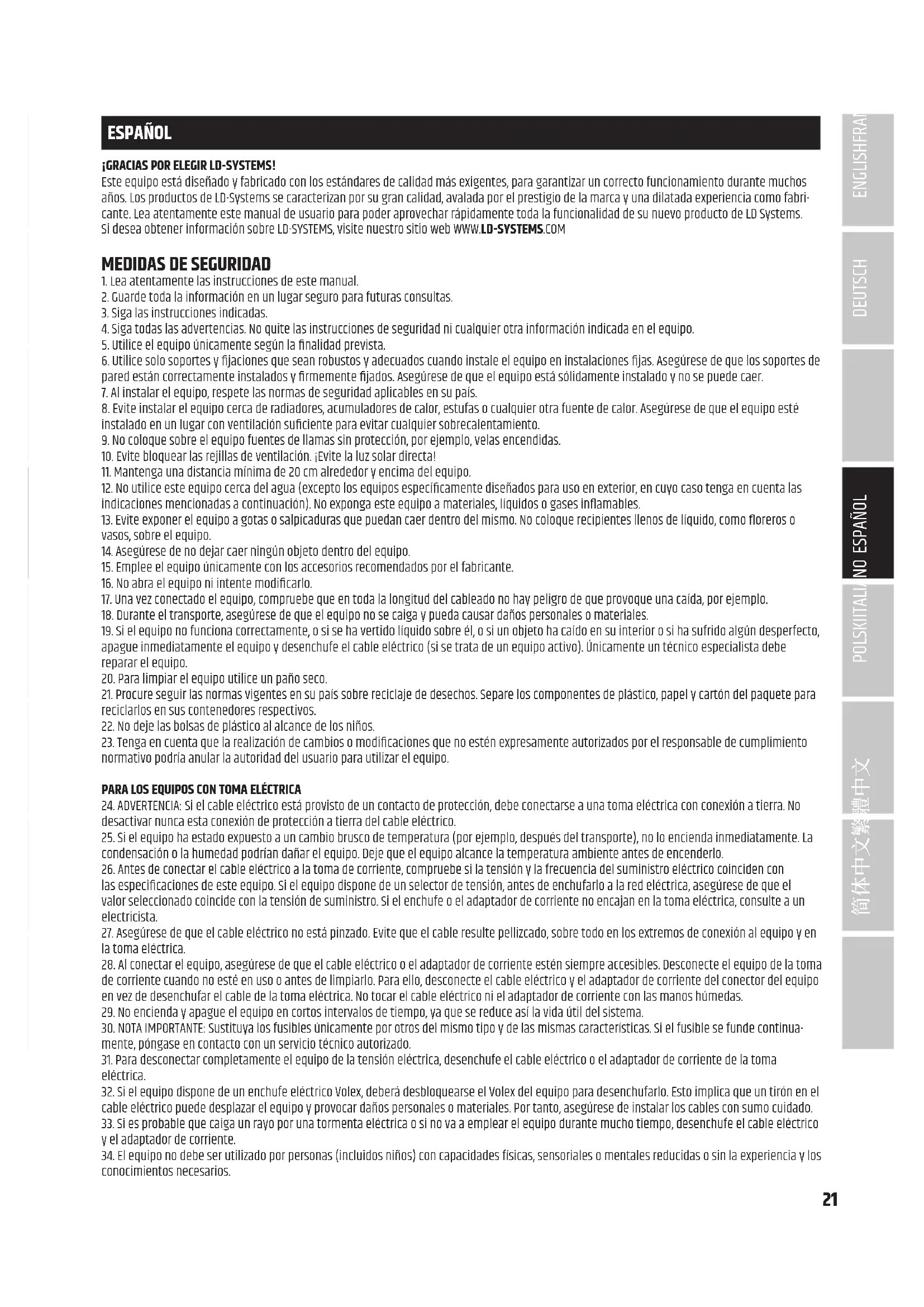 ESPAÑOL ¡GRACIAS POR ELEGIR LD-SYSTEMS! Este equipo está diseñado y fabricado con los estándares de calidad más exigentes, para garantizar un correcto funcionamiento durante muchos años. Los productos de LD-Systems se caracterizan por su gran calidad, avalada por el prestigio de la marca y una dilatada experiencia como fabri- cante. Lea atentamente este manual de usuario para poder aprovechar rápidamente toda la funcionalidad de su nuevo producto de LD Systems. Si desea obtener información sobre LD-SYSTEMS, visite nuestro sitio web WWW.LD-SYSTEMS.COM