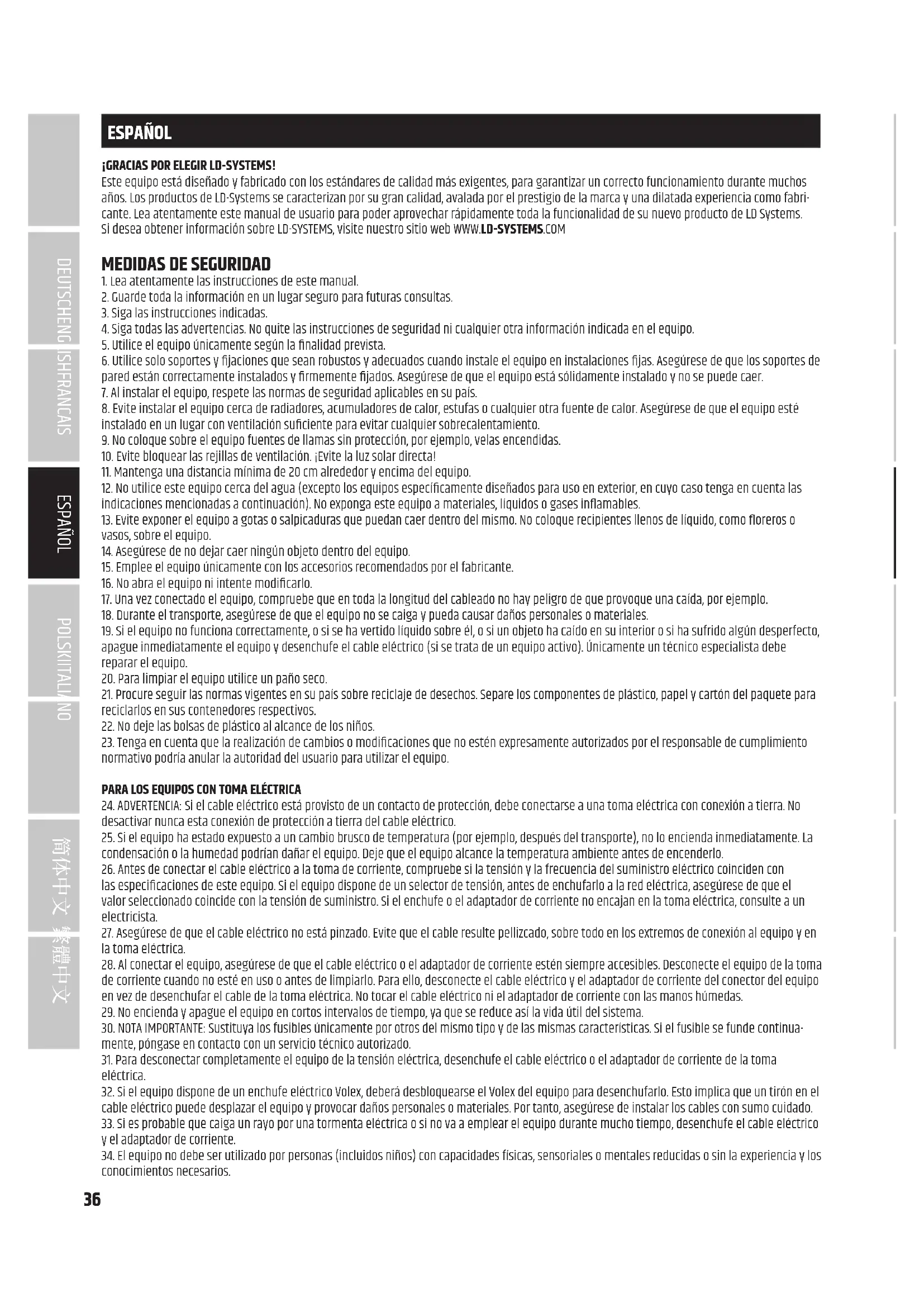 ESPAÑOL ¡GRACIAS POR ELEGIR LD-SYSTEMS! Este equipo está diseñado y fabricado con los estándares de calidad más exigentes, para garantizar un correcto funcionamiento durante muchos años. Los productos de LD-Systems se caracterizan por su gran calidad, avalada por el prestigio de la marca y una dilatada experiencia como fabri- cante. Lea atentamente este manual de usuario para poder aprovechar rápidamente toda la funcionalidad de su nuevo producto de LD Systems. Si desea obtener información sobre LD-SYSTEMS, visite nuestro sitio web WWW.LD-SYSTEMS.COM