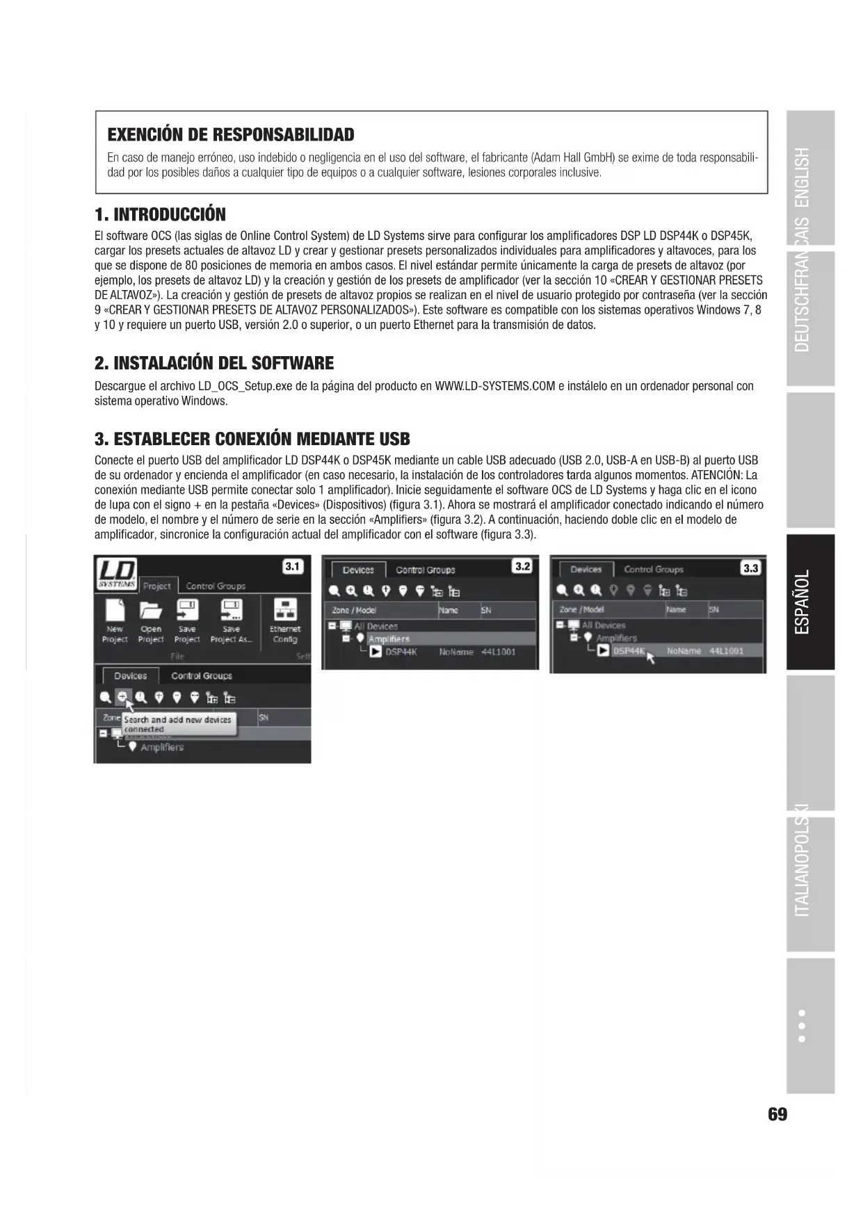 Conecte el puerto USB del amplificador LD DSP44K o DSP45K mediante un cable USB adecuado (USB 2.0, USB-A en USB-B) al puerto USB de su ordenador y encienda el amplificador (en caso necesario, la instalación de los controladores tarda algunos momentos. ATENCIÓN: La conexión mediante USB permite conectar solo 1 amplificador). Inicie seguidamente el software OCS de LD Systems y haga clic en el icono de lupa con el signo + en la pestaña «Devices» (Dispositivos) (figura 3.1). Ahora se mostrará el amplificador conectado indicando el número de modelo, el nombre y el número de serie en la sección «Amplifiers» (figura 3.2). A continuación, haciendo doble clic en el modelo de amplificador, sincronice la configuración actual del amplificador con el software (figura 3.3).