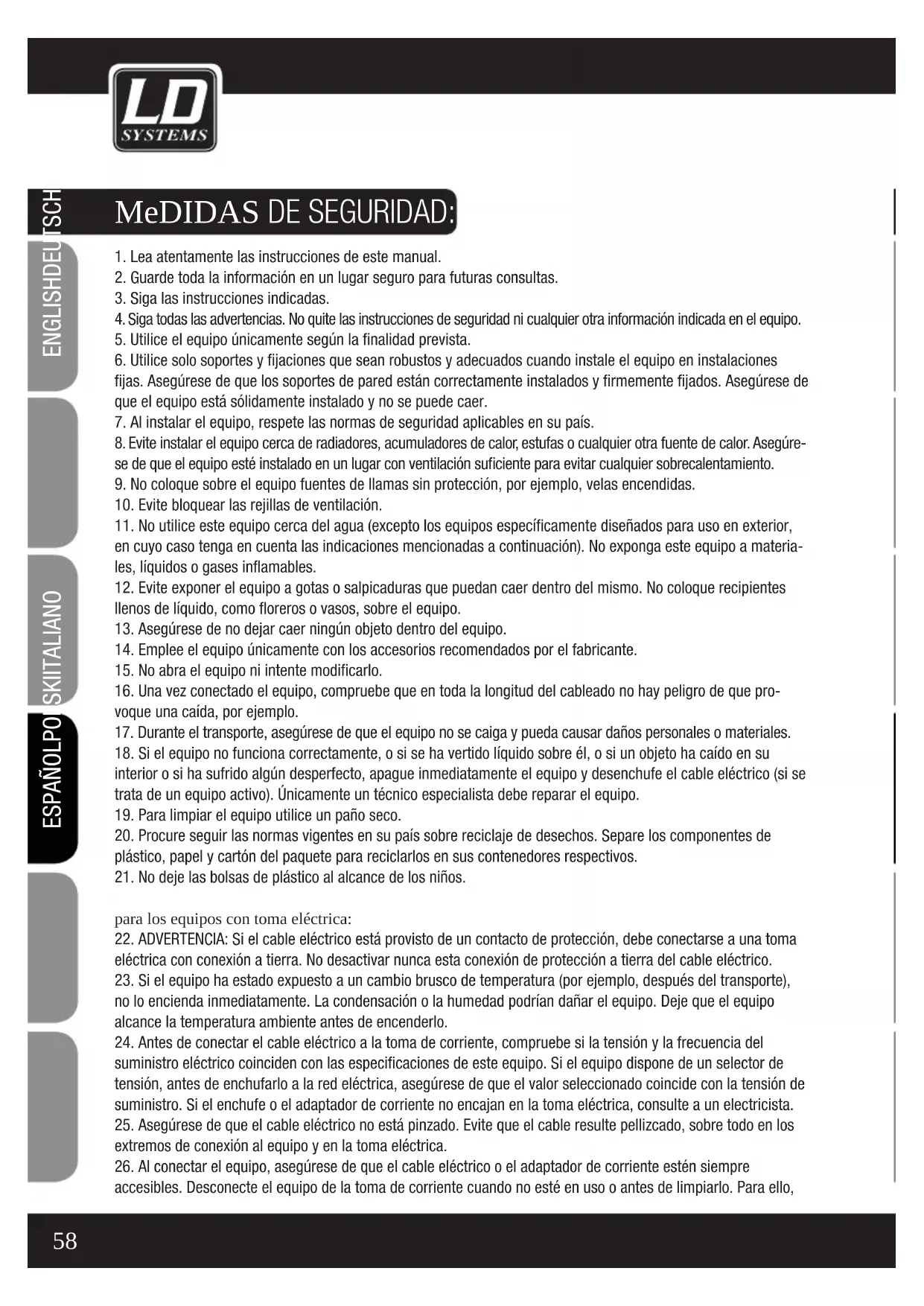 ITALIANOPOLSKIESPAÑOL FRANCAISFRANCAIS FRANCAISFRANCAIS FRANCAISDEUTSCHENGLISH70 ENGLISHDEUTSCHFRANCAIS FRANCAISFRANCAIS FRANCAISFRANCAIS ESpAñoLpoLSKIITALIANo DeCLARACIÓn DeL FaBricante: GARAnTÍA DEL FABRICANTE La presente garantía cubre las marcas Adam Hall, LD Systems, Defender, Palmer y Cameo. Se aplica a todos los productos distribuidos por Adam Hall. No afecta a los derechos de garantía legal que asume el fabricante. De hecho, le concede al usuario derechos adicionales ante Adam Hall, independientes de la garantía legal. Adam Hall garantiza que el producto que ha adquirido de Adam Hall o de un distribuidor autorizado de Adam Hall estará exento de defectos de material y fabricación, en condiciones normales de uso, durante un período de 2 o 5 años (consúltese el producto concreto) a partir de la fecha de compra. La garantía limitada entra en vigor el día de la fecha de compra. Para tener derecho a esta garantía será nece- sario presentar un justificante de compra válido en el que figure la fecha de compra del producto, por ejemplo, la factura o el albarán de entrega. Si el producto que ha adquirido necesitara una reparación durante la vigencia de la garantía limitada, tendrá derecho a obtener los servicios de garantía conforme a los términos y condiciones establecidos en este documento. Durante el periodo de garantía limitada, Adam Hall se compromete a reparar o sustituir las piezas defectuosas del producto. En caso de reparación o sustitución dentro del período de garantía, las piezas originales y productos retirados pasarán a ser propiedad de Adam Hall. En el caso poco probable de que se produzca un fallo recurrente en el producto adquirido, Adam Hall, a su entera discreción, podrá optar por sustituir dicho producto defectuoso por otro de similares características. Adam Hall no garantiza el funcionamiento ininterrumpido y sin fallos de este producto. Además, Adam Hall no se hace responsable de los posibles daños ocasionados por no seguir las instrucciones de uso suministradas con el producto Adam Hall. Esta garantía no se aplica - a los consumibles (baterías, etc.) - a los productos cuyo número de serie ha sido borrado, o que han quedado dañados y defectuosos debido a un accidente - en caso de defectos ocasionados por una incorrecta utilización o manipulación, o cualquier otra causa ajena - en caso de utilización del producto no conforme con los parámetros establecidos en la documentación facilitada con el producto - en caso de utilización de piezas de repuesto no fabricadas, no recomendadas ni vendidas por Adam Hall - si el producto ha sido modificado o reparado por personal no autorizado por Adam Hall. Estos términos y condiciones constituyen el acuerdo de garantía íntegro y exclusivo entre usted y Adam Hall en relación con el producto Adam Hall que acaba de adquirir.71 ITALIANOPOLSKIESPAÑOL FRANCAISFRANCAIS FRANCAISFRANCAIS FRANCAISDEUTSCHENGLISH DeCLARACIÓn DeL FaBricante: LIMITACIÓn DE RESPONSABILIDAD Si durante el período de garantía aparecen defectos de material o de fabricación en su producto Adam Hall (de acuerdo con las garantías mencionadas en este documento), tendrá derecho exclusivamente a la reparación o sustitución del mismo. La responsabilidad máxima de Adam Hall en virtud de los términos de esta garantía está limitada al menor importe que resulte del precio de compra del producto, del coste de la reparación o la sustitu- ción de las piezas que han dejado de funcionar en condiciones normales de uso. Adam Hall no será responsable de ningún daño causado por el producto o por el mal funcionamiento del producto, incluidas la pérdida de beneficios, la pérdida de ahorros o cualquier consecuencia derivada de dichas pérdidas. Además, Adam Hall no se hará responsable de ninguna reclamación presentada por un tercero o por el comprador original en nombre de un tercero. Esta limitación de responsabilidad se aplicará con independencia de que se solicite una indemnización por daños y perjuicios, o se presenten reclamaciones por negligencia, contractuales o de cualquier otra índole, y no podrá ser derogada o modificada. Esta limitación de responsabilidad será efectiva incluso en el caso de que el com- prador hubiese avisado previamente a Adam Hall o a alguno de sus representantes de la posibilidad de reclamar daños y perjuicios. No obstante, esta limitación de responsabilidad no tendrá efecto en caso de reclamación por daños personales. Esta garantía limitada le otorga derechos legales específicos. Puede que posea derechos adicionales conforme a la legislación del país o Estado en el que se encuentre. Le recomendamos que consulte la legislación vigente en su país o Estado para conocer el alcance de sus derechos. APLICACIÓN DE LA GARAnTÍA Para solicitar asistencia técnica en relación con el producto en garantía, póngase en contacto con Adam Hall o con el distribuidor autorizado donde adquirió el producto. DeCLARACIÓn Ce De conFormiDaD Los productos distribuidos por Adam Hall cumplen (según proceda) los requisitos esenciales de las Directivas europeas 1999/5/CE (Equipos radioeléctricos y equipos terminales de telecomunicación, R&TTE), 2004/108/ CE (Compatibilidad Electromagnética) y 2006/95/CE (Baja Tensión), así como las correspondientes cláusulas adicionales. Para más información consulte www.adamhall.com.72 ENGLISHDEUTSCHFRANCAIS FRANCAISFRANCAIS FRANCAISFRANCAIS ESpAñoLpoLSKIITALIANo DeCLARACIÓn DeL FaBricante: eLIMInACIÓn CoRReCTA DE ESTE PRODUCTO (Aplicable en la Unión Europea y en los países europeos que dispongan de un sistema de recogida selectiva) El símbolo que aparece sobre el producto o en la documentación adjunta indica que al final de la vida útil del equipo, no deberá desecharlo con los demás residuos domésticos, con el fin de evitar posibles efectos negativos en el medio ambiente y en la salud humana debidos al vertido incontrolado de desechos. La 