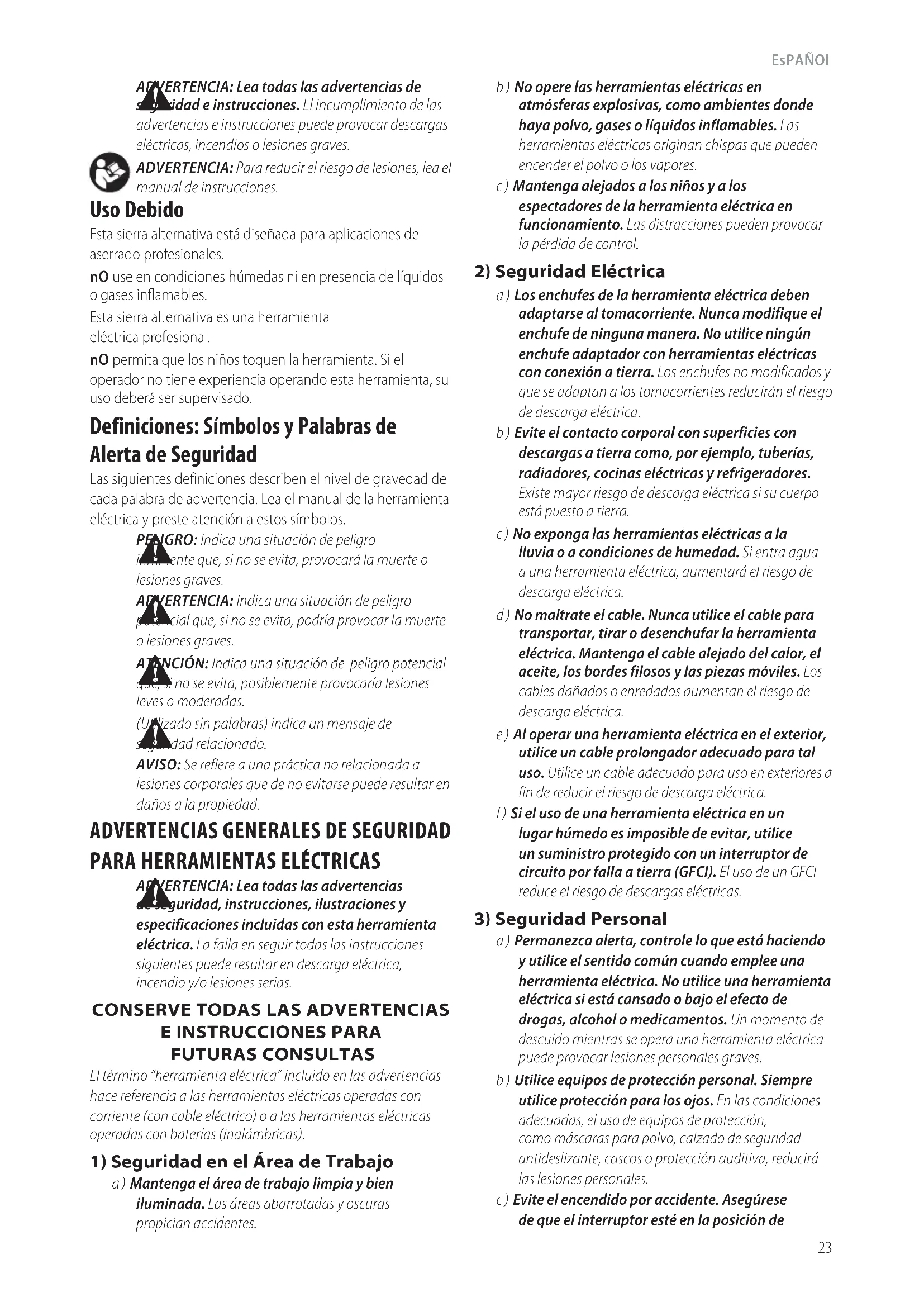 (Utilizado sin palabras) indica un mensaje de seguridadrelacionado. AVISO: Se refiere a una práctica no relacionada a lesiones corporales que de no evitarse puede resultar en daños a lapropiedad. Uso Debido Esta sierra alternativa está diseñada para aplicaciones de aserradoprofesionales. nO use en condiciones húmedas ni en presencia de líquidos o gasesinflamables. Esta sierra alternativa es una herramienta eléctricaprofesional. nO permita que los niños toquen la herramienta. Si el operador no tiene experiencia operando esta herramienta, su uso deberá sersupervisado. b ) No opere las herramientas eléctricas en atmósferas explosivas, como ambientes donde haya polvo, gases o líquidos inflamables. Las herramientas eléctricas originan chispas que pueden encender el polvo o losvapores. c ) Mantenga alejados a los niños y a los espectadores de la herramienta eléctrica en funcionamiento. Las distracciones pueden provocar la pérdida decontrol.