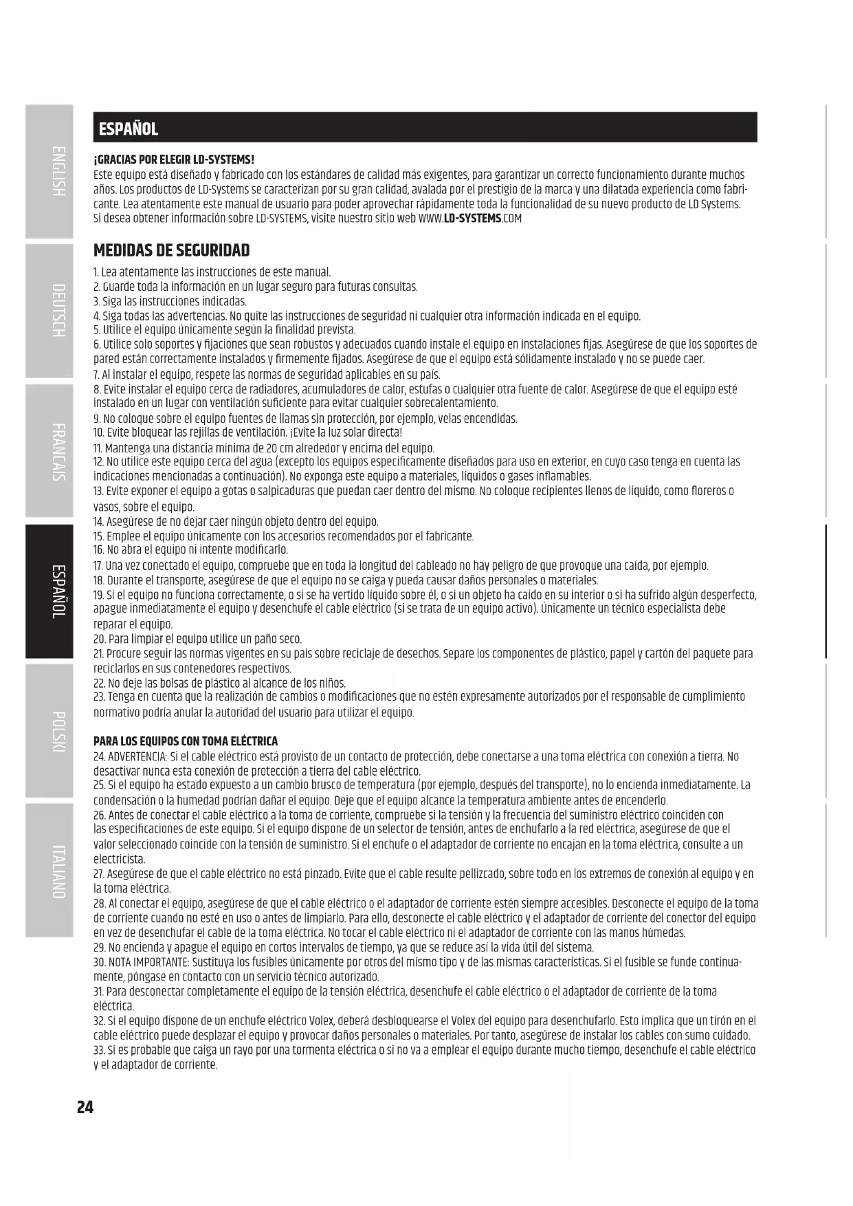 30. NOTA IMPORTANTE: Sustituya los fusibles únicamente por otros del mismo tipo y de las mismas características. Si el fusible se funde continua- mente, póngase en contacto con un servicio técnico autorizado. 31. Para desconectar completamente el equipo de la tensión eléctrica, desenchufe el cable eléctrico o el adaptador de corriente de la toma eléctrica. 32. Si el equipo dispone de un enchufe eléctrico Volex, deberá desbloquearse el Volex del equipo para desenchufarlo. Esto implica que un tirón en el cable eléctrico puede desplazar el equipo y provocar daños personales o materiales. Por tanto, asegúrese de instalar los cables con sumo cuidado. 33. Si es probable que caiga un rayo por una tormenta eléctrica o si no va a emplear el equipo durante mucho tiempo, desenchufe el cable eléctrico y el adaptador de corriente.25 DEUTSCHFRANCAIS ESPAÑOL ENGLISH ITALIANO POLSKI 34. El equipo no debe ser utilizado por personas (incluidos niños) con capacidades físicas, sensoriales o mentales reducidas o sin la experiencia y los conocimientos necesarios.