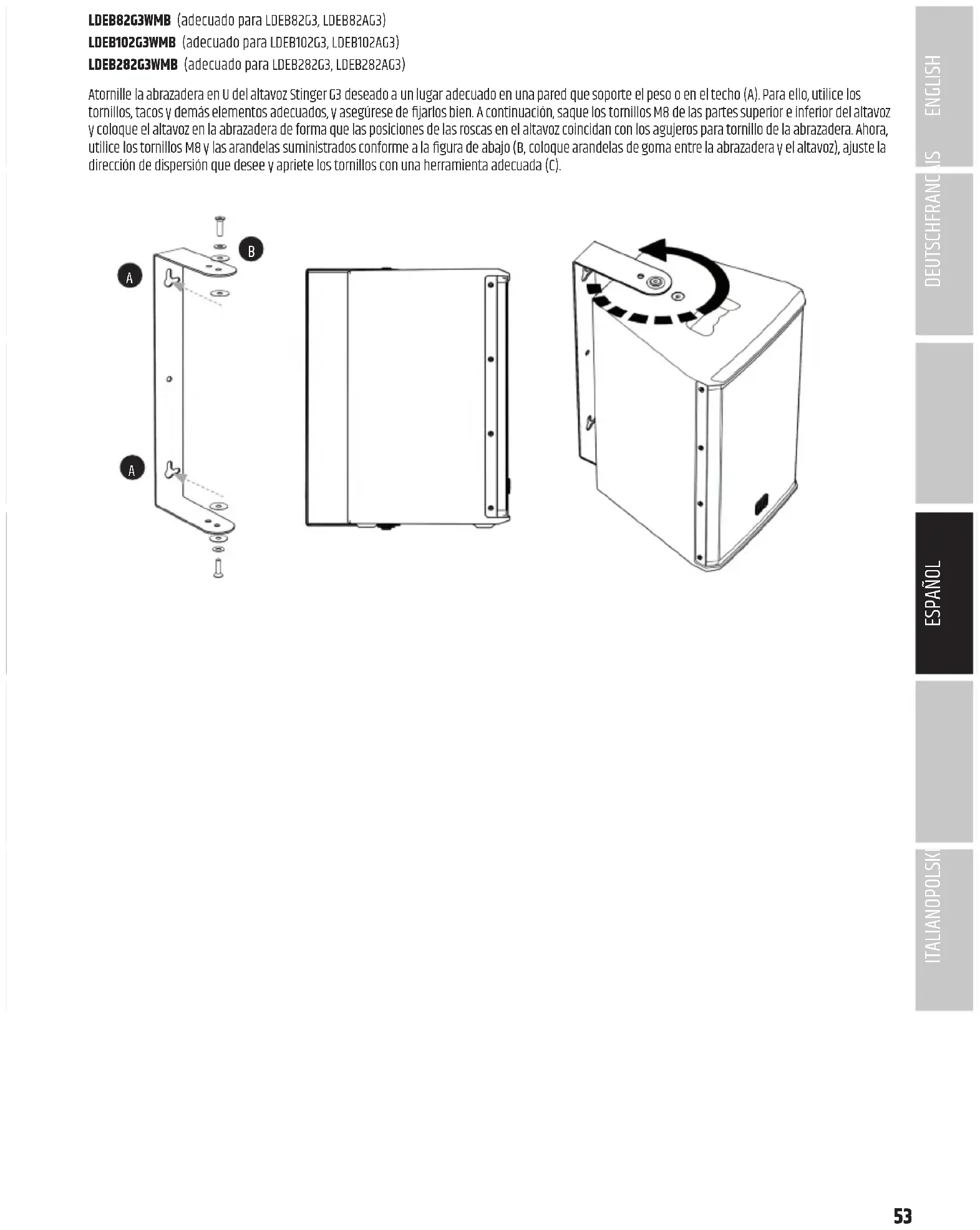 LDEB82G3WMB (adecuado para LDEB82G3, LDEB82AG3) LDEB102G3WMB (adecuado para LDEB102G3, LDEB102AG3) LDEB282G3WMB (adecuado para LDEB282G3, LDEB282AG3) Atornille la abrazadera en U del altavoz Stinger G3 deseado a un lugar adecuado en una pared que soporte el peso o en el techo (A). Para ello, utilice los tornillos, tacos y demás elementos adecuados, y asegúrese de jarlos bien. A continuación, saque los tornillos M8 de las partes superior e inferior del altavoz y coloque el altavoz en la abrazadera de forma que las posiciones de las roscas en el altavoz coincidan con los agujeros para tornillo de la abrazadera. Ahora, utilice los tornillos M8 y las arandelas suministrados conforme a la gura de abajo (B, coloque arandelas de goma entre la abrazadera y el altavoz), ajuste la dirección de dispersión que desee y apriete los tornillos con una herramienta adecuada (C).