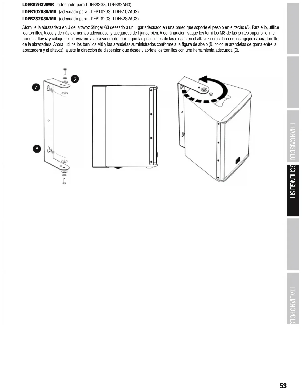 LDEB82G3WMB (adecuado para LDEB82G3, LDEB82AG3) LDEB102G3WMB (adecuado para LDEB102G3, LDEB102AG3) LDEB282G3WMB (adecuado para LDEB282G3, LDEB282AG3) Atornille la abrazadera en U del altavoz Stinger G3 deseado a un lugar adecuado en una pared que soporte el peso o en el techo (A). Para ello, utilice los tornillos, tacos y demás elementos adecuados, y asegúrese de fijarlos bien. A continuación, saque los tornillos M8 de las partes superior e infe- rior del altavoz y coloque el altavoz en la abrazadera de forma que las posiciones de las roscas en el altavoz coincidan con los agujeros para tornillo de la abrazadera. Ahora, utilice los tornillos M8 y las arandelas suministrados conforme a la figura de abajo (B, coloque arandelas de goma entre la abrazadera y el altavoz), ajuste la dirección de dispersión que desee y apriete los tornillos con una herramienta adecuada (C). ITALIANOPOLSKIESPAÑOL FRANCAISDEUTSCHENGLISH 53A