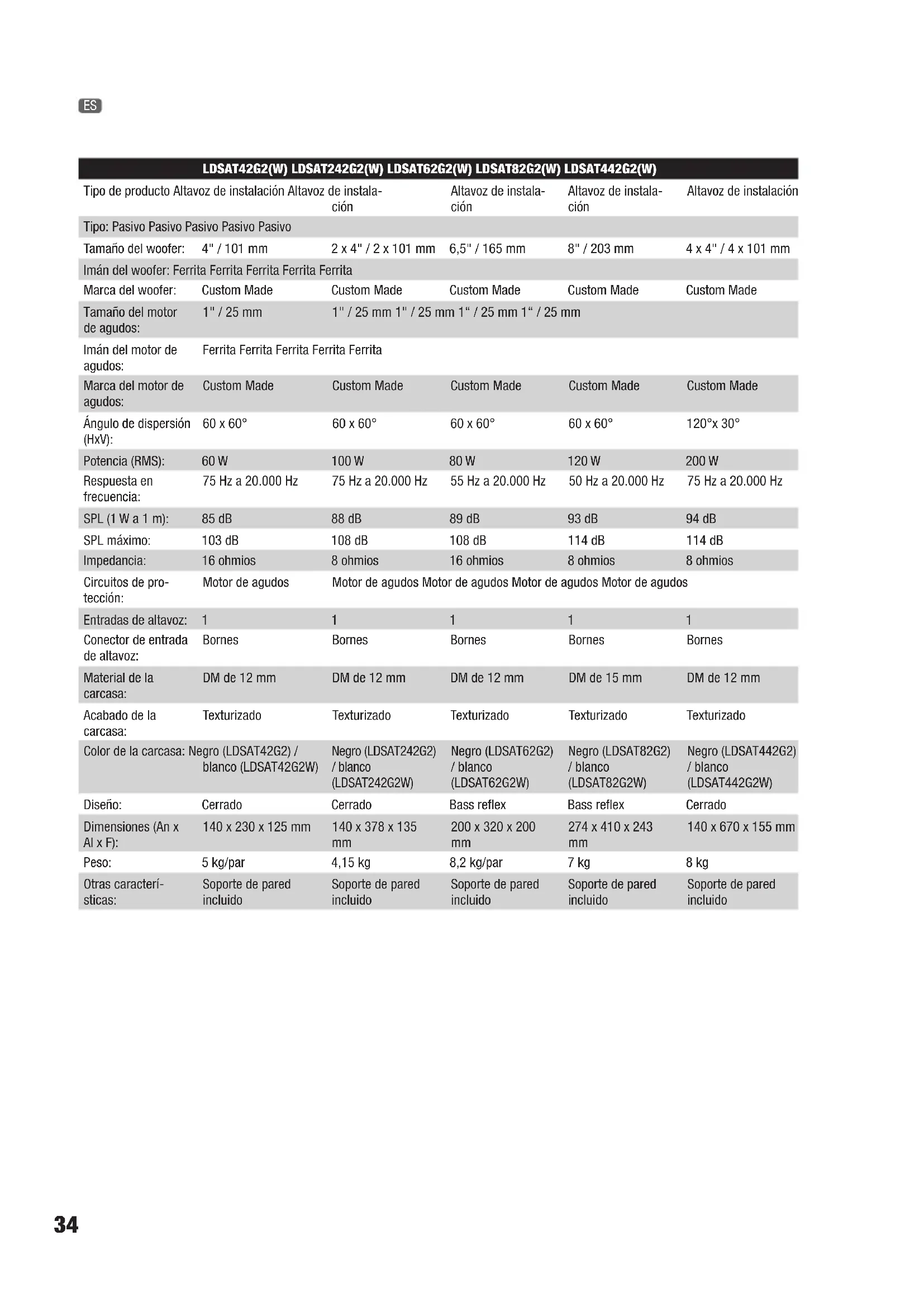 140x670x155 mm Peso: 5 kg/par 4,15 kg 8,2 kg/par 7 kg 8 kg Otras caracterí- sticas: Soporte de pared incluido Soporte de pared incluido Soporte de pared incluido Soporte de pared incluido Soporte de pared incluido ES35 LDSUB88 Tipo de producto: Subwoofer de instalación Tipo: Pasivo Tamaño del woofer: 2 x 8" / 2 x 203 mm Imán del woofer: Ferrita Marca del woofer: Custom Made Potencia (RMS): 200 (2x100)W Respuesta en frecuencia: 40 Hz a 120 Hz SPL (1 W a 1 m): 92 dB SPL máximo: 115 dB Impedancia: 2 x 8 ohmios Entradas de altavoz: 2 Conector de entrada de altavoz: Bornes Salidas de altavoz: 2 Conectores de salida de altavoz: Bornes Material de la carcasa: DM de 15 mm Acabado de la carcasa: Texturizado Color de la carcasa: Negro Diseño: Pasabanda Dimensiones (An x Al x F): 600 x 250 x 350 mm Peso: 13,3 kg Otras características: Filtro paso bajos interno (120 Hz) LDSAT62AG2(W) LDSAT82AG2(W) Tipo de producto: Altavoz de instalación Altavoz de instalación Tipo: Activo Activo Tamaño del woofer: 6,5" / 165 mm 8" / 203.2 mm Imán del woofer: Ferrita Ferrita Marca del woofer: Custom Made Custom Made Tamaño del motor de agudos: 1" / 25 mm 1" / 25 mm Imán del motor de agudos: Ferrita Ferrita Marca del motor de agudos: Custom Made Custom Made Amplificador: Clase AB Clase AB Ángulo de dispersión (HxV): 60 x 60° 60 x 60° Potencia (RMS): 50 W 80 W Respuesta en frecuencia: 55 Hz a 20.000 Hz 50 Hz a 20.000 Hz SPL máximo: 108 dB 114 dB Circuitos de protección: Motor de agudos, sobreintensidad Sobreintensidad, motor de agudos Controles: Interruptor de encendi- do/apagado, control de volumen, conmutador AUTO/ON Control de volumen, interruptor de encendido, selector Power Mode (On/Auto) Indicadores: Power Power, Limit Conectores de entrada de línea: Combo XLR/jack de 6,3 mm Jack de 6,3 mm, XLR Conectores de salida de línea: XLR XLR Alimentación eléctrica: Transformador Transformador Alimentación eléctrica: 220/240 VAC, 50/60 Hz 110 V AC – 120 V AC, 50 – 60 Hz (US)