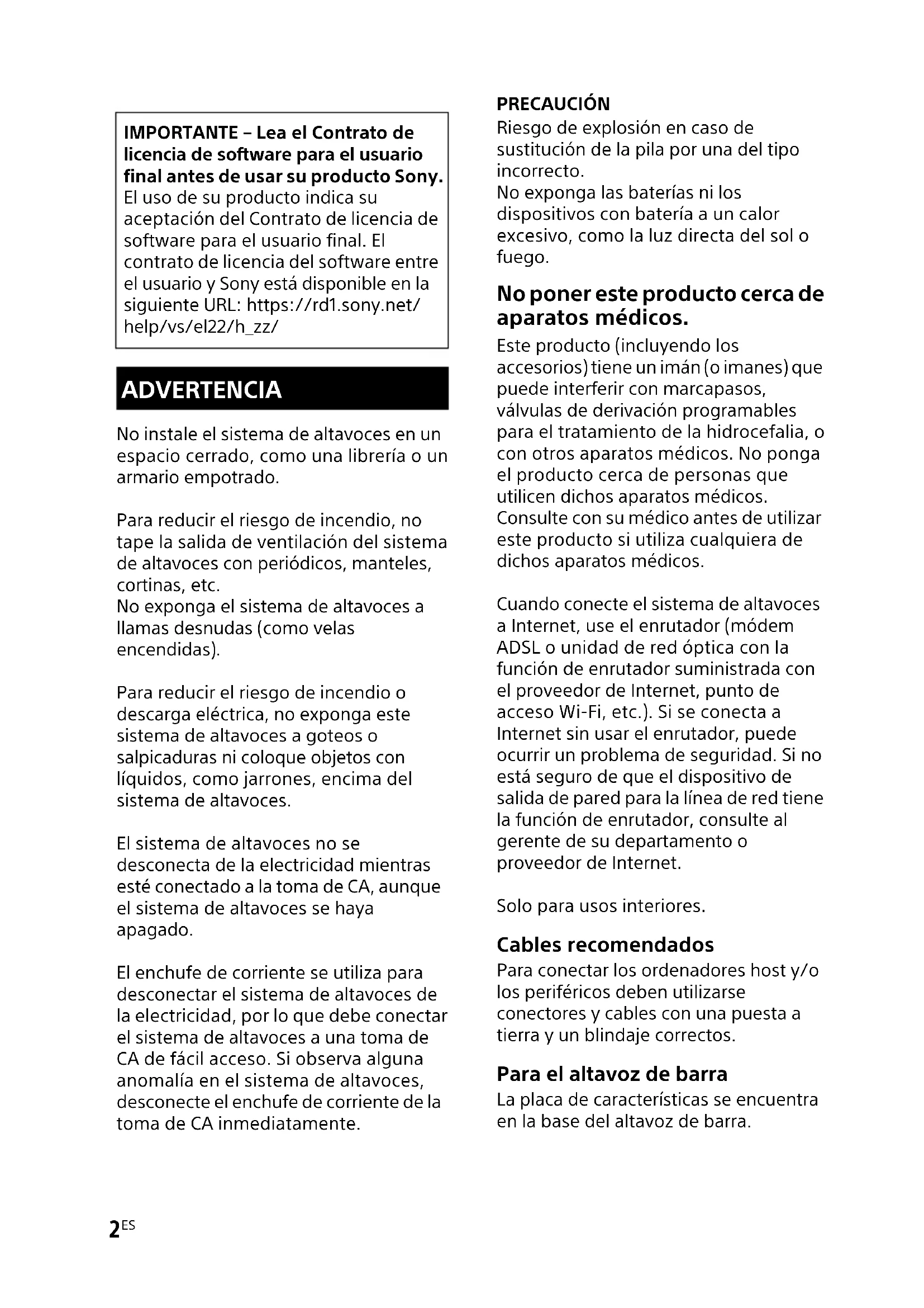 No instale el sistema de altavoces en un espacio cerrado, como una librería o un armario empotrado. Para reducir el riesgo de incendio, no tape la salida de ventilación del sistema de altavoces con periódicos, manteles, cortinas, etc. No exponga el sistema de altavoces a llamas desnudas (como velas encendidas). Para reducir el riesgo de incendio o descarga eléctrica, no exponga este sistema de altavoces a goteos o salpicaduras ni coloque objetos con líquidos, como jarrones, encima del sistema de altavoces. El sistema de altavoces no se desconecta de la electricidad mientras esté conectado a la toma de CA, aunque el sistema de altavoces se haya apagado. El enchufe de corriente se utiliza para desconectar el sistema de altavoces de la electricidad, por lo que debe conectar el sistema de altavoces a una toma de CA de fácil acceso. Si observa alguna anomalía en el sistema de altavoces, desconecte el enchufe de corriente de la toma de CA inmediatamente. PRECAUCIÓN Riesgo de explosión en caso de sustitución de la pila por una del tipo incorrecto. No exponga las baterías ni los dispositivos con batería a un calor excesivo, como la luz directa del sol o fuego. No poner este producto cerca de aparatos médicos. Este producto (incluyendo los accesorios) tiene un imán (o imanes) que puede interferir con marcapasos, válvulas de derivación programables para el tratamiento de la hidrocefalia, o con otros aparatos médicos. No ponga el producto cerca de personas que utilicen dichos aparatos médicos. Consulte con su médico antes de utilizar este producto si utiliza cualquiera de dichos aparatos médicos. Cuando conecte el sistema de altavoces a Internet, use el enrutador (módem ADSL o unidad de red óptica con la función de enrutador suministrada con el proveedor de Internet, punto de acceso Wi-Fi, etc.). Si se conecta a Internet sin usar el enrutador, puede ocurrir un problema de seguridad. Si no está seguro de que el dispositivo de salida de pared para la línea de red tiene la función de enrutador, consulte al gerente de su departamento o proveedor de Internet. Solo para usos interiores. Cables recomendados Para conectar los ordenadores host y/o los periféricos deben utilizarse conectores y cables con una puesta a tierra y un blindaje correctos. Para el altavoz de barra La placa de características se encuentra en la base del altavoz de barra. IMPORTANTE – Lea el Contrato de licencia de software para el usuario final antes de usar su producto Sony. El uso de su producto indica su aceptación del Contrato de licencia de software para el usuario final. El contrato de licencia del software entre el usuario y Sony está disponible en la siguiente URL: https://rd1.sony.net/ help/vs/el22/h_zz/ ADVERTENCIA3