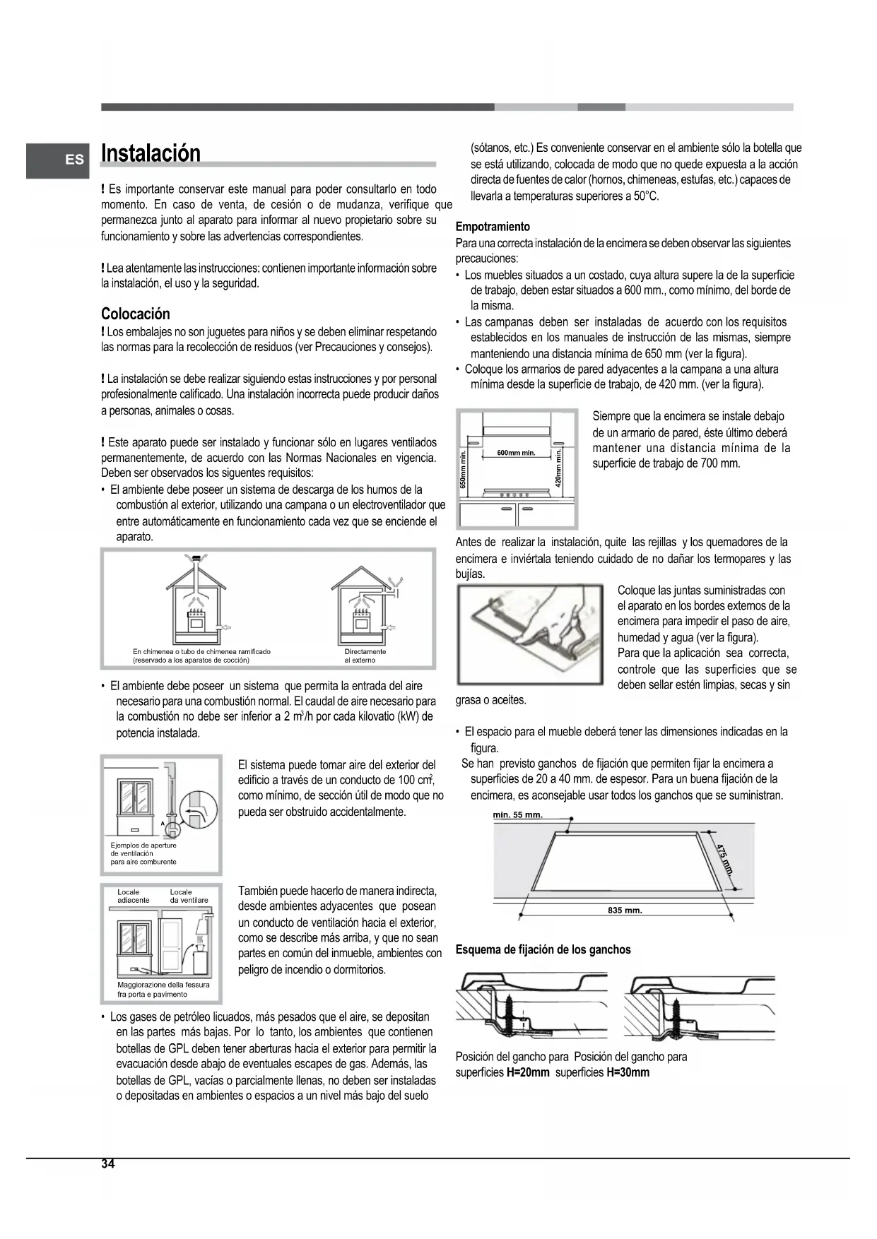 - El espacio para el mueble deberá tener las dimensiones indicadas en la gura. Se han previsto ganchos de jación que permiten jar la encimera a supercies de 20 a 40 mm. de espesor. Para un buena jación de la encimera, es aconsejable usar todos los ganchos que se suministran. 475 mm. 835 mm. min. 55 mm. Esquema de jación de los ganchos Posición del gancho para Posición del gancho para supercies H=20mm supercies H=30mm 600mm min. 420mm min. 650mm min.ES