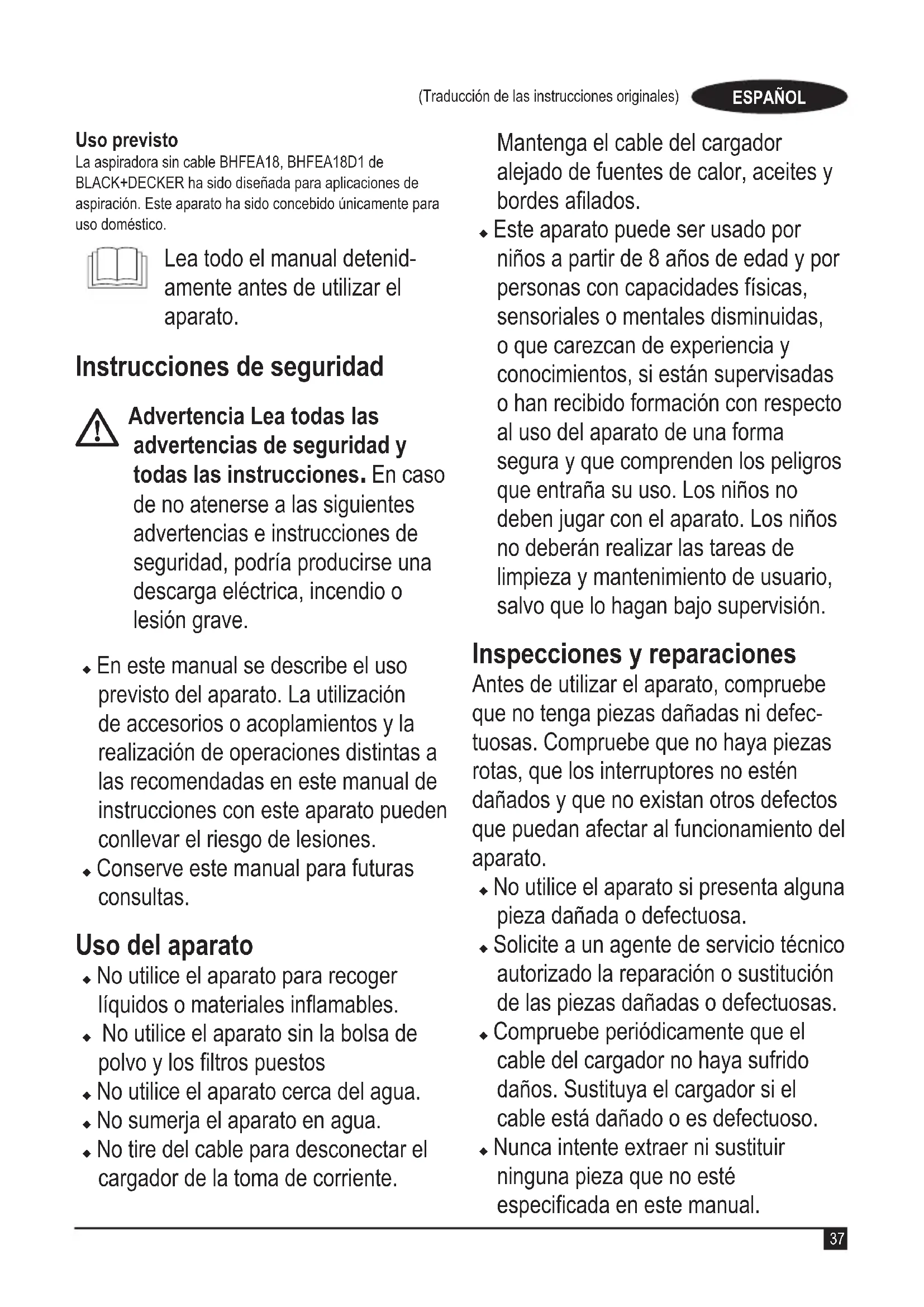Advertencia Lea todas las advertencias de seguridad y todas las instrucciones. En caso de no atenerse a las siguientes advertencias e instrucciones de seguridad, podría producirse una descarga eléctrica, incendio o lesión grave. u En este manual se describe el uso previsto del aparato. La utilización de accesorios o acoplamientos y la realización de operaciones distintas a las recomendadas en este manual de instrucciones con este aparato pueden conllevar el riesgo de lesiones. u Conserve este manual para futuras consultas. Uso del aparato u No utilice el aparato para recoger líquidos o materiales inamables. uNo utilice el aparato sin la bolsa de polvo y los ltros puestos u No utilice el aparato cerca del agua.u No sumerja el aparato en agua.u No tire del cable para desconectar el cargador de la toma de corriente. Mantenga el cable del cargador alejado de fuentes de calor, aceites y bordes alados. u Este aparato puede ser usado por niños a partir de 8 años de edad y por personas con capacidades físicas, sensoriales o mentales disminuidas, o que carezcan de experiencia y conocimientos, si están supervisadas o han recibido formación con respecto al uso del aparato de una forma segura y que comprenden los peligros que entraña su uso. Los niños no deben jugar con el aparato. Los niños no deberán realizar las tareas de limpieza y mantenimiento de usuario, salvo que lo hagan bajo supervisión. Inspecciones y reparaciones Antes de utilizar el aparato, compruebe que no tenga piezas dañadas ni defec- tuosas. Compruebe que no haya piezas rotas, que los interruptores no estén dañados y que no existan otros defectos que puedan afectar al funcionamiento del aparato. u No utilice el aparato si presenta alguna pieza dañada o defectuosa. u Solicite a un agente de servicio técnico autorizado la reparación o sustitución de las piezas dañadas o defectuosas. u Compruebe periódicamente que el cable del cargador no haya sufrido daños. Sustituya el cargador si el cable está dañado o es defectuoso. u Nunca intente extraer ni sustituir ninguna pieza que no esté especicada en este manual.38 (Traducción de las instrucciones originales) ESPAÑOL Instrucciones de seguridad adi- cionales Después de la utilización u Desenchufe el cargador antes de limpiarlo o antes de limpiar la base de carga. u Cuando no utilice el aparato, debe guardarlo en un lugar seco. u Los niños no deben tener acceso a los aparatos guardados. Riesgos residuales El uso de esta herramienta puede pro- ducir riesgos residuales adicionales no incluidos en las advertencias de seguri- dad adjuntas. Estos riesgos se pueden generar por un uso incorrecto, demasia- do prolongado, etc. El cumplimiento de las normas de seguridad correspondientes y el uso de dispositivos de seguridad no evitan ciertos riesgos residuales. Dichos riesgos incluyen: u Lesiones producidas por el contacto con piezas móviles o giratorias. u Lesiones causadas al cambiar piezas, cuchillas o accesorios. u Lesiones causadas por el uso prolongado de una herramienta. Si utiliza una herramienta durante períodos de tiempo demasiado prolongados, asegúrese de realizar pausas con frecuencia. u Deterioro auditivo.u Riesgos para la salud causados por la respiración del polvo generado por el uso de la herramienta (por ejemplo, al trabajar con madera, especialmente roble, haya y tablero semiduro de bras). Baterías y cargadores Baterías (se venden por separado) u Las baterías recargables deben retirarse del aparato antes de cargarlo. u Las baterías deben insertarse con la polaridad correcta. u Las baterías agotadas deben sacarse del aparato antes de cargarlo y deben eliminarse en modo seguro. u Si el aparato se guarda porque no se va a usar durante un largo periodo, hay que sacarle las baterías. u Los terminales de alimentación no deben estar en cortocircuito. u Jamás trate de abrir las baterías por ningún motivo. u No exponga la batería al agua.u No exponga la batería al calor.u No guarde la batería en lugares en los que la temperatura pueda superar los 40 ºC. u Realice la carga únicamente a una temperatura ambiente de entre 10 °C y 40 °C. u Utilice únicamente el cargador suministrado con el aparato o la herramienta para realizar la carga. La utilización de un cargador incorrecto puede producir una descarga eléctrica o el recalentamiento de la batería.39 (Traducción de las instrucciones originales)ESPAÑOLu Para desechar las baterías, siga las instrucciones facilitadas en la sección “Protección del medioambiente». u No dañe ni deforme la batería mediante perforaciones o golpes, pues ello puede causar riesgo de incendio y de lesiones. u No cargue baterías dañadas.u Es posible que se produzcan fugas en las baterías en condiciones extremas. Cuando observe que se producen fugas en las baterías, limpie cuidadosamente el líquido con un paño. Evite el contacto con la piel. u En caso de contacto con la piel o los ojos, siga las instrucciones facilitadas a continuación. ¡Advertencia! El líquido de la batería puede provocar lesiones o daños materiales. En caso de contacto con la piel, lave la zona afectada con agua inmediatamente. Si se produce enrojecimiento, dolor o irritación, solicite atención médica. En caso de contacto con los ojos, lave la zona inmediatamente con agua limpia y solicite atención médica. Cargadores (se venden por separado) El cargador ha sido diseñado para un voltaje especíco. Compruebe siempre que el voltaje de la red eléctrica corresponda al indicado en la placa de datos y en la información técnica de la tabla de datos. ¡Advertencia! No intente sustituir el cargador por un enchufe convencional para la red eléctrica. u Debe utilizar solo el cargador BLACK+DECKER suministrado con el aparato/herramienta para cargar la batería. Otras baterías podrían explotar y provocar lesiones y daños materiales. u Nunca intente cargar baterías no recargables. u Si se daña el cable de alimentación, el fabric