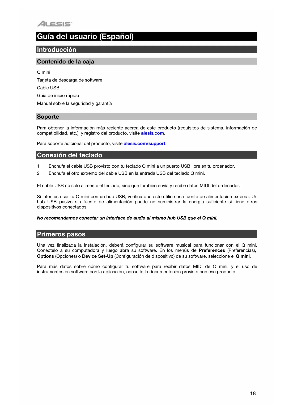 - Prueba a usar un cable USB distinto. He enchufado el Q mini a mi ordenador pero las luces del teclado no se encienden. No todos los puertos USB tienen potencia suficiente para un dispositivo como el Q mini. Intenta enchufarlo en otro puerto USB para ver si eso remedia el problema. También puedes conectar un hub USB active a tu ordenador y enchufar tu Q mini al hub. Cuando pulso una tecla, hay una demora antes de escuchar la nota. Este retardo, que se produce con mayor frecuencia en sistemas Windows, es conocido como latencia. Este problema lo causa el tiempo que necesita tu software de grabación para recibir y procesar los datos MIDI transmitidos desde el Q mini, y enviar la señal de audio resultante a tu interface de audio o tarjeta de sonido, y a tus cascos o altavoces. Para reducir la cantidad de latencia, deberás seleccionar un nuevo driver de las opciones disponibles enumeradas en la ventana de preferencias de audio (u opciones de audio) dentro de tu software. Si no estás seguro sobre cómo acceder a las preferencias de audio, consulta las instrucciones respectivas en la documentación provista con tu software. Si todavía sufres un problema de latencia, puede encontrar más información sobre resolución de problemas en nuestra web en: alesis.com/support.33 Guide d'utilisation (Français) Présentation Contenu de la boîte Q mini clavier Carte de téléchargement de logiciel Câble USB Guide d'utilisation rapide Consignes de sécurité et informations concernant la garantie Assistance technique Pour les toutes dernières informations concernant ce produit (configuration système, compatibilité, etc.), veuillez visiter le site alesis.com. Pour de l’assistance supplémentaire, veuillez visiter le site alesis.com/support. Connexion de votre clavier