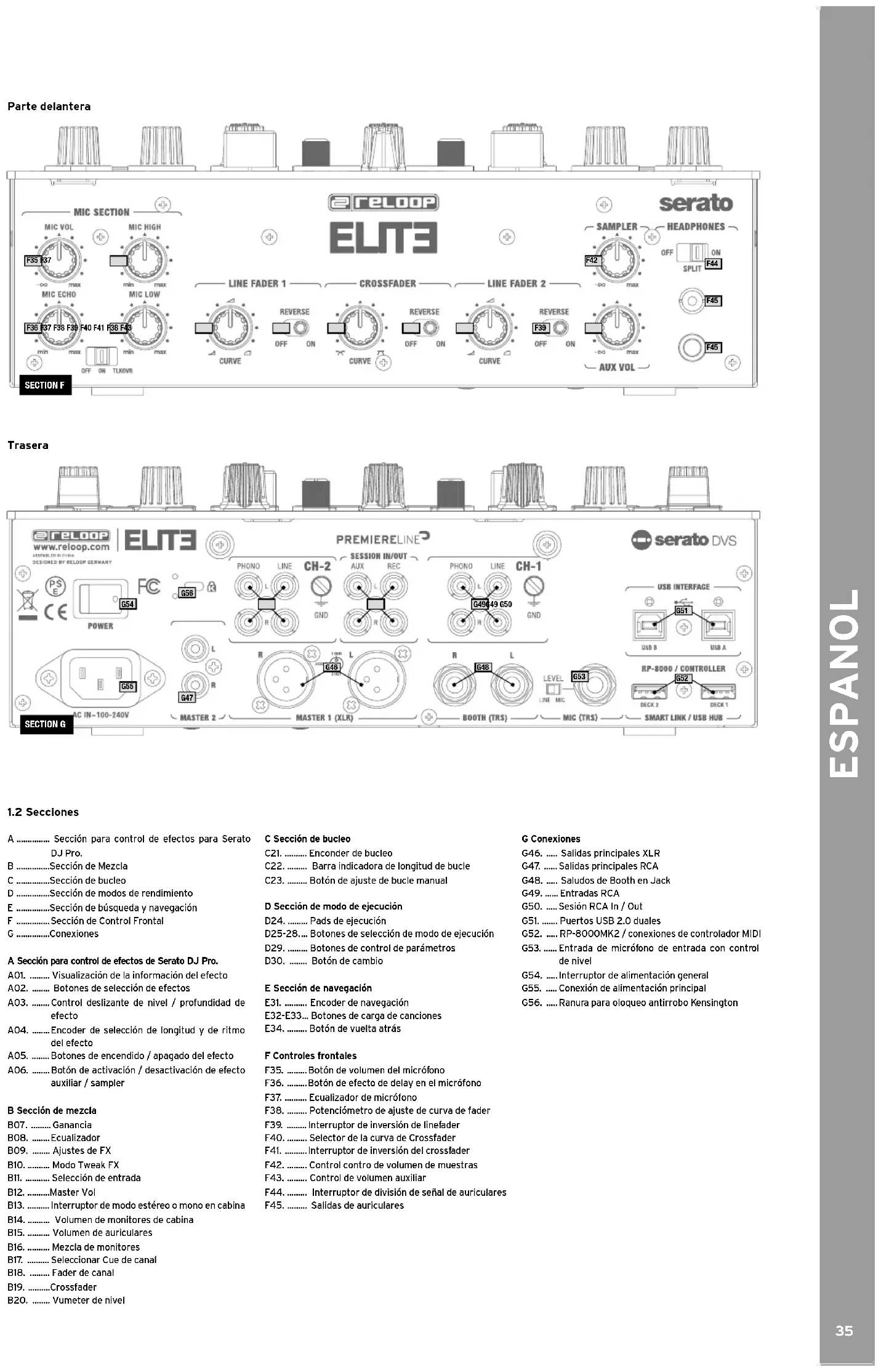 A ............... Sección para control de efectos para Serato DJ Pro. B ...............Sección de Mezcla C ...............Sección de bucleo D ...............Sección de modos de rendimiento E ...............Sección de búsqueda y navegación F ............... Sección de Control Frontal G ...............Conexiones A Sección para control de efectos de Serato DJ Pro. A01. ......... Visualización de la información del efecto A02. ........ Botones de selección de efectos A03. ........ Control deslizante de nivel / profundidad de efecto A04. ........ Encoder de selección de longitud y de ritmo del efecto A05. ........ Botones de encendido / apagado del efecto A06. ........ Botón de activación / desactivación de efecto auxiliar / sampler B Sección de mezcla B07. ......... Ganancia B08. ........ Ecualizador B09. ........ Ajustes de FX B10. .......... Modo Tweak FX B11. ........... Selección de entrada B12. .......... Master Vol B13. .......... Interruptor de modo estéreo o mono en cabina B14. .......... Volumen de monitores de cabina B15. .......... Volumen de auriculares B16. .......... Mezcla de monitores B17. .......... Seleccionar Cue de canal B18. ......... Fader de canal B19. .......... Crossfader B20. ........ Vumeter de nivel C Sección de bucleo C21. .......... Enconder de bucleo C22. ......... Barra indicadora de longitud de bucle C23. ......... Botón de ajuste de bucle manual D Sección de modo de ejecución D24. ......... Pads de ejecución D25-28. ... Botones de selección de modo de ejecución D29. ......... Botones de control de parámetros D30. ........ Botón de cambio E Sección de navegación E31. .......... Encoder de navegación E32-E33 ... Botones de carga de canciones E34. ......... Botón de vuelta atrás F Controles frontales F35. ......... Botón de volumen del micrófono F36. ......... Botón de efecto de delay en el micrófono F37. .......... Ecualizador de micrófono F38. ......... Potenciómetro de ajuste de curva de fader F39. ......... Interruptor de inversión de linefader F40. ......... Selector de la curva de Crossfader F41. .......... Interruptor de inversión del crossfader F42. ......... Control contro de volumen de muestras F43. ......... Control de volumen auxiliar F44. ......... Interruptor de división de señal de auriculares F45. ......... Salidas de auriculares G Conexiones G46. ..... Salidas principales XLR G47. ...... Salidas principales RCA G48. ..... Saludos de Booth en Jack G49. ...... Entradas RCA G50. ..... Sesión RCA In / Out G51. ....... Puertos USB 2.0 duales G52. ..... RP-8000MK2 / conexiones de controlador MIDI G53. ...... Entrada de micrófono de entrada con control de nivel G54. ..... Interruptor de alimentación general G55. ..... Conexión de alimentación principal G56. ..... Ranura para oloqueo antirrobo KensingtonESPANOL