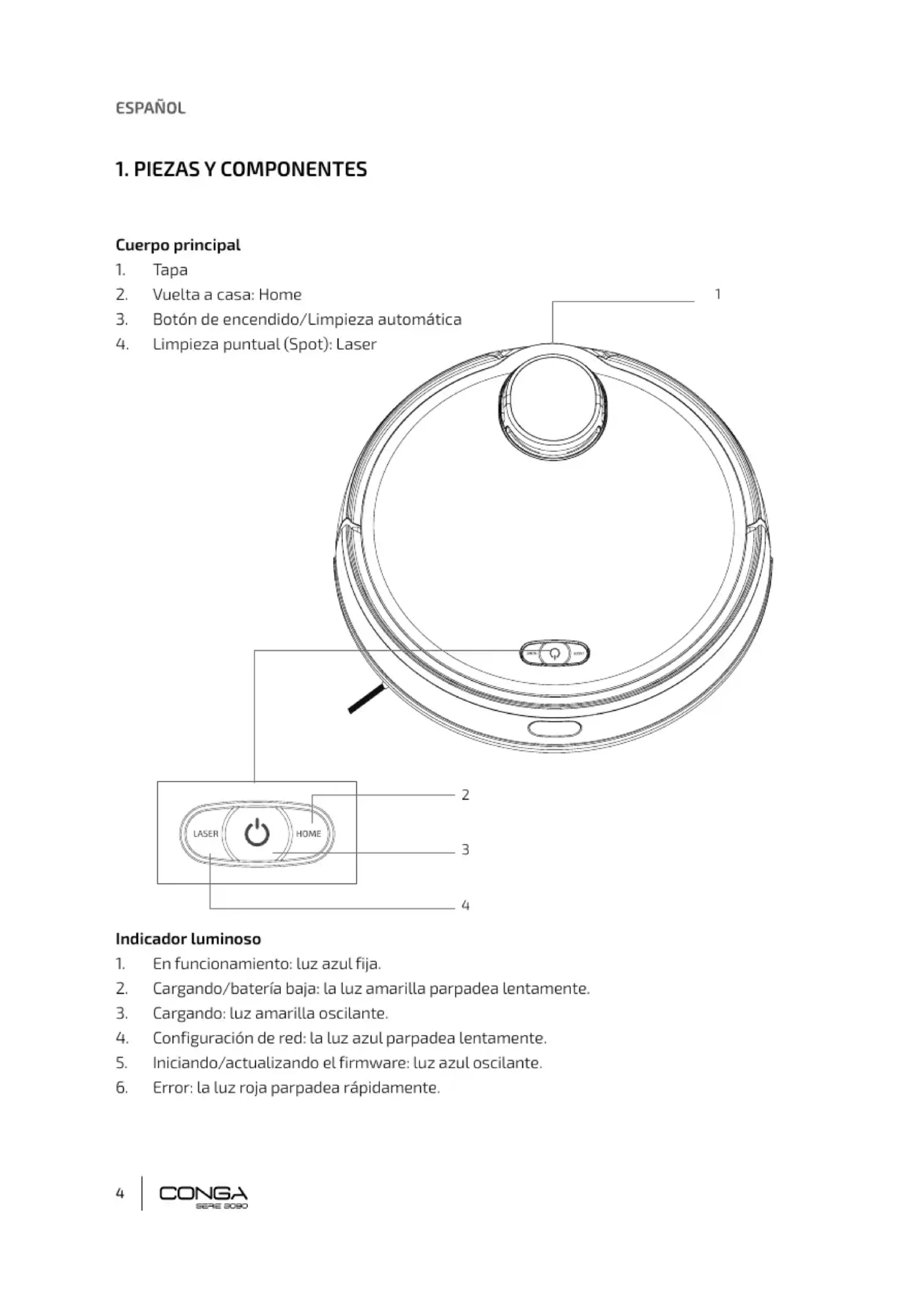 - El indicador luminoso cambiará de amarillo parpadeante a azul fijo cuando la batería esté totalmente cargada y el robot esté listo para funcionar.