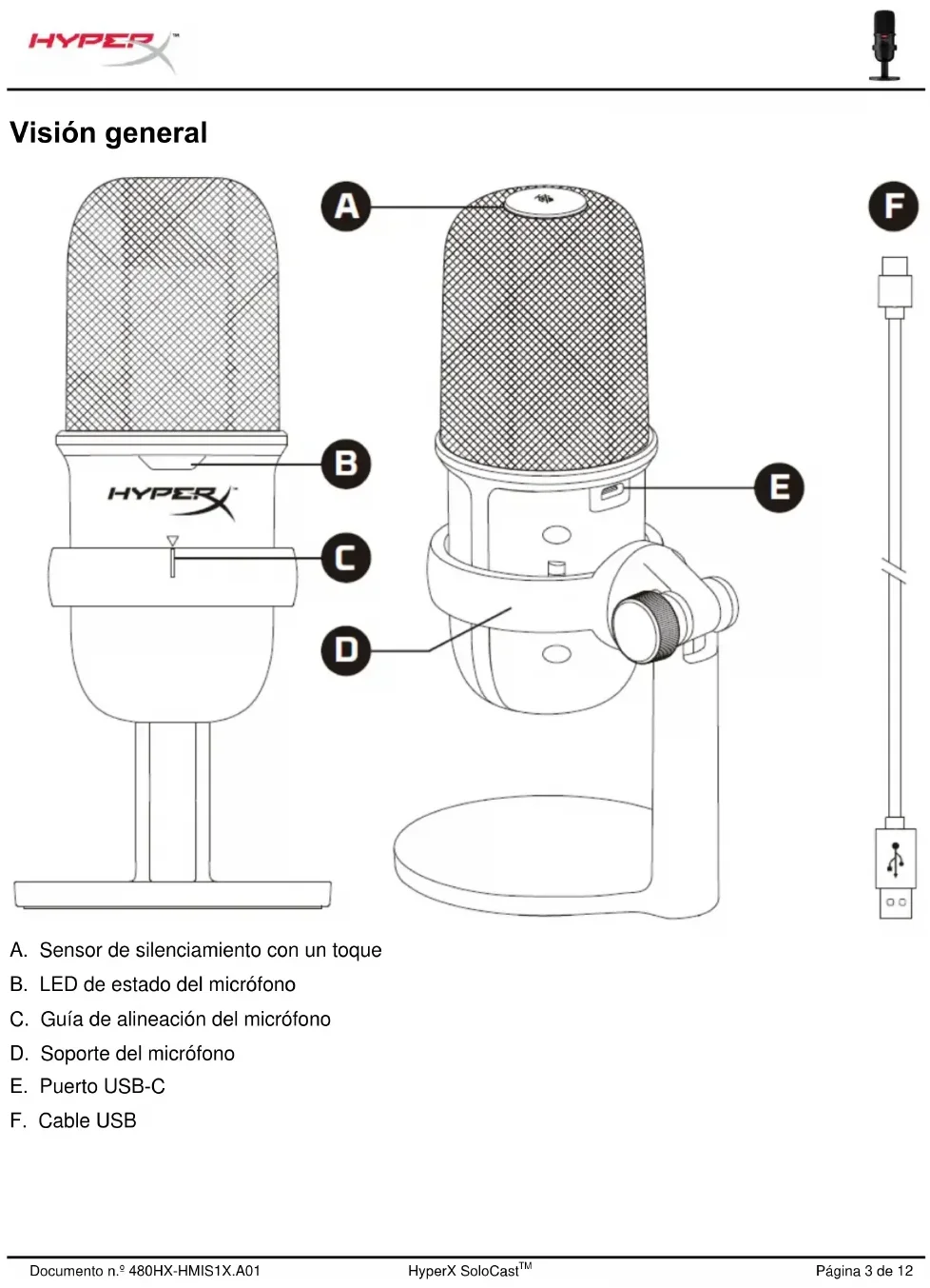 Visión general A. Sensor de silenciamiento con un toque B. LED de estado del micrófono C. Guía de alineación del micrófono D. Soporte del micrófono E. Puerto USB-C F. Cable USBDocumento n.º 480HX-HMIS1X.A01 HyperX SoloCast