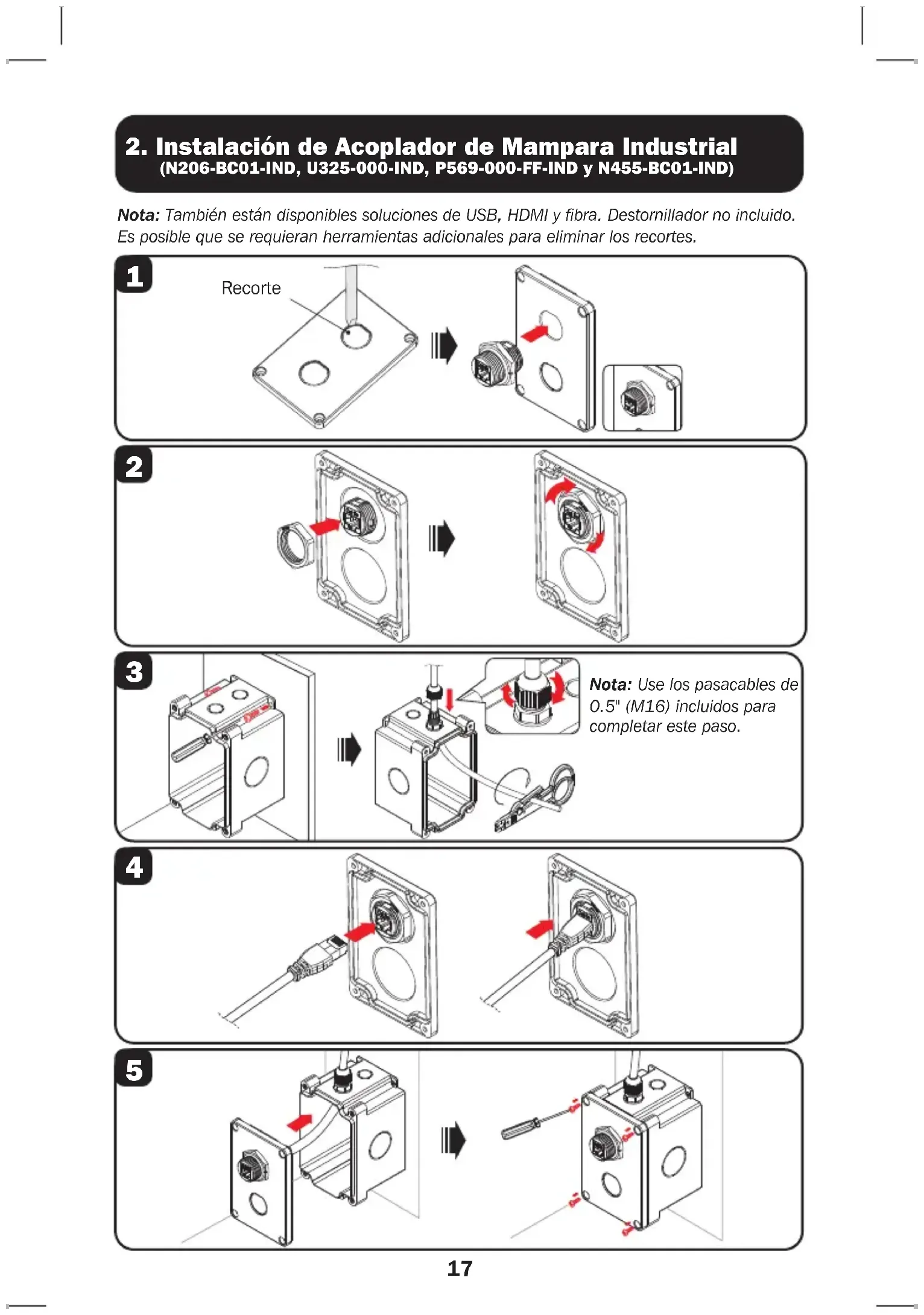 (N206-BC01-IND, U325-000-IND, P569-000-FF-IND y N455-BC01-IND)Nota: También están disponibles soluciones de USB, HDMI y fibra. Destornillador no incluido. Es posible que se requieran herramientas adicionales para eliminar los recortes.