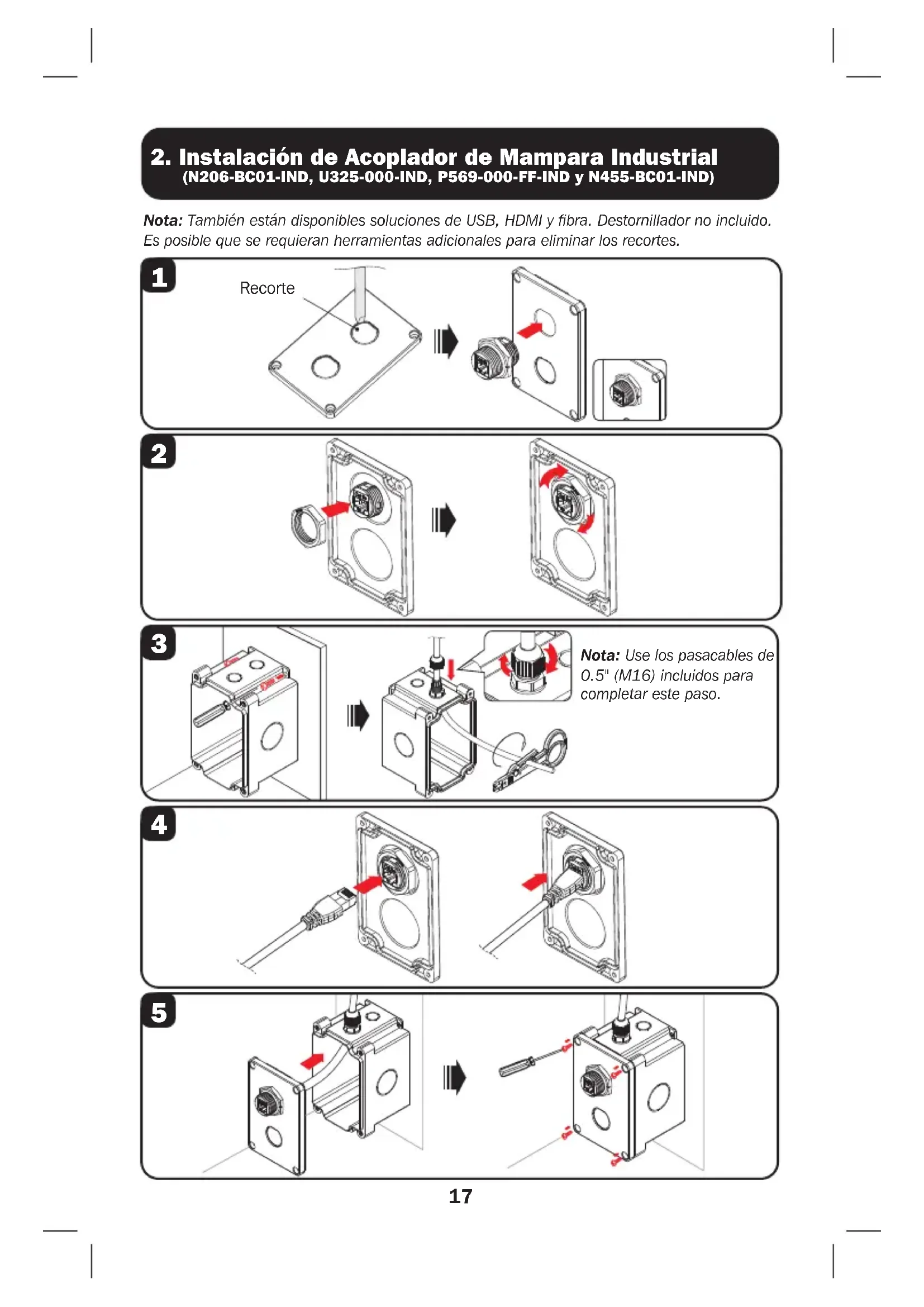 (N206-BC01-IND, U325-000-IND, P569-000-FF-IND y N455-BC01-IND)Nota: También están disponibles soluciones de USB, HDMI y fibra. Destornillador no incluido. Es posible que se requieran herramientas adicionales para eliminar los recortes.