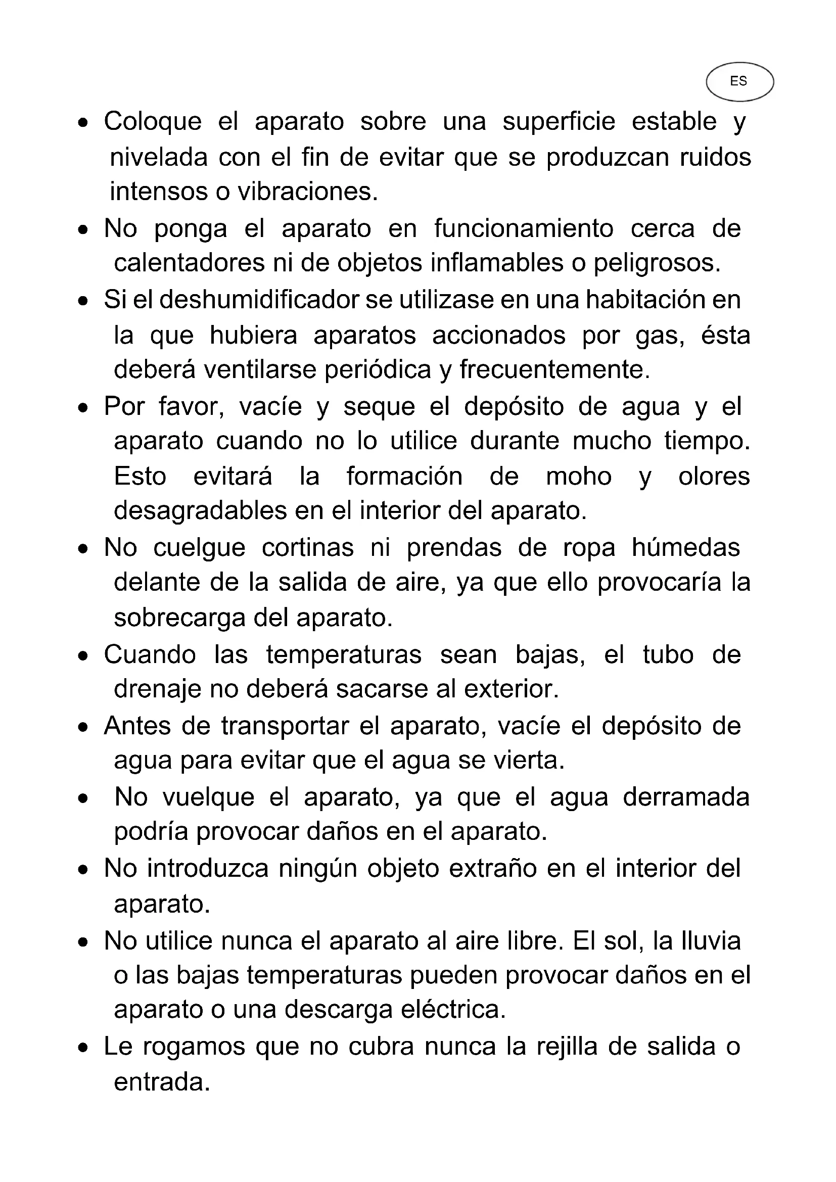 - Si el deshumidificador se utilizase en una habitación en la que hubiera aparatos accionados por gas, ésta deberá ventilarse periódica y frecuentemente.