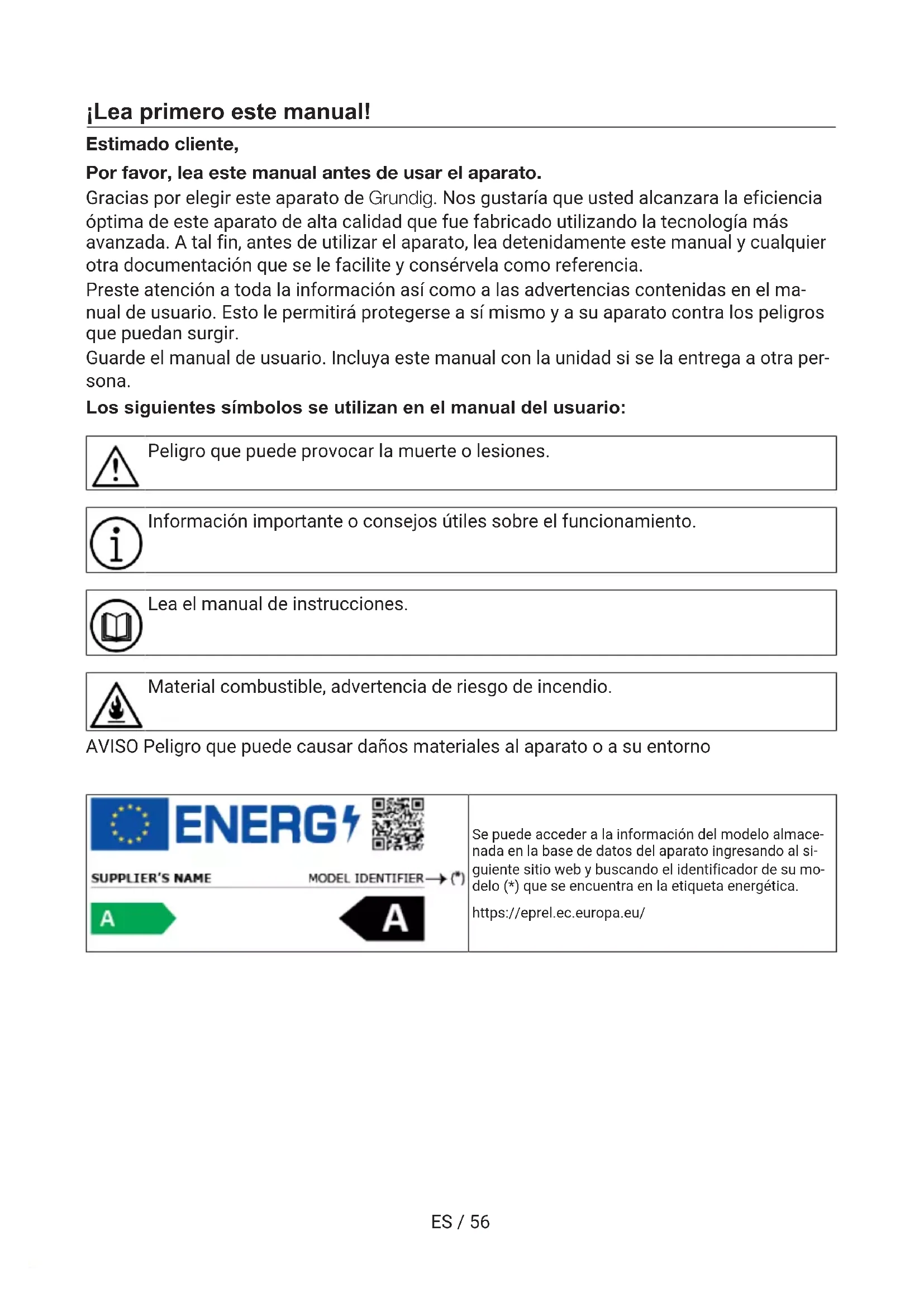 PTES / 56 ¡Lea primero este manual! Estimado cliente, Por favor, lea este manual antes de usar el aparato. Gracias por elegir este aparato de Grundig. Nos gustaría que usted alcanzara la eficiencia óptima de este aparato de alta calidad que fue fabricado utilizando la tecnología más avanzada. A tal fin, antes de utilizar el aparato, lea detenidamente este manual y cualquier otra documentación que se le facilite y consérvela como referencia. Preste atención a toda la información así como a las advertencias contenidas en el ma- nual de usuario. Esto le permitirá protegerse a sí mismo y a su aparato contra los peligros que puedan surgir. Guarde el manual de usuario. Incluya este manual con la unidad si se la entrega a otra per- sona. Los siguientes símbolos se utilizan en el manual del usuario: Peligro que puede provocar la muerte o lesiones. Información importante o consejos útiles sobre el funcionamiento. Lea el manual de instrucciones. Material combustible, advertencia de riesgo de incendio. AVISO Peligro que puede causar daños materiales al aparato o a su entorno Se puede acceder a la información del modelo almace- nada en la base de datos del aparato ingresando al si- guiente sitio web y buscando el identificador de su mo- delo (*) que se encuentra en la etiqueta energética. https://eprel.ec.europa.eu/ES / 57 1 Instrucciones de seguridad ......... 58