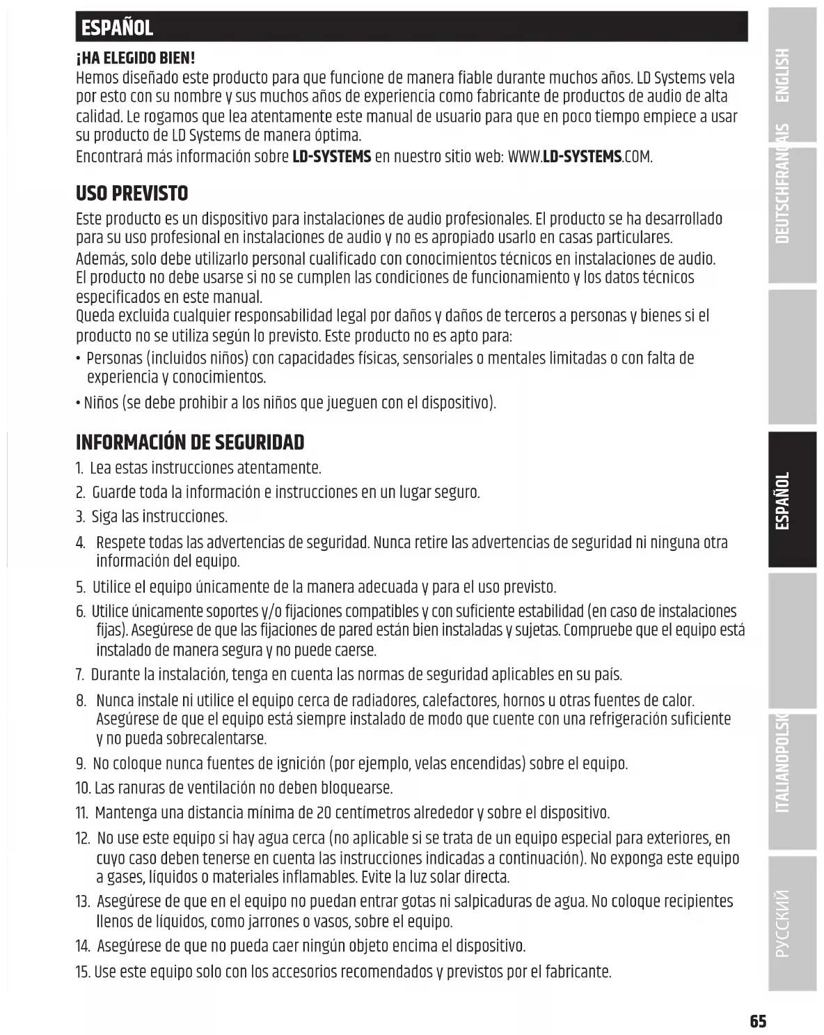 AdamHallGmbH confirme par le présent document que cet équipement hertzien est conforme à la directive 2014/53/EU. Vous trouverez le texte complet de la déclaration UE de conformité à l’adresse suivante: www.adamhall.com/compliance/ Le présent document peut contenir des erreurs et fautes d’impression et peut faire l’objet de modifications, notamment techniques. ITALIANO POLSKI ESPAÑOL FRANÇAIS DEUTSCHENGLISH РУССКИЙ65 ESPAÑOL ¡HA ELEGIDO BIEN! Hemos diseñado este producto para que funcione de manera fiable durante muchos años. LD Systems vela por esto con su nombre y sus muchos años de experiencia como fabricante de productos de audio de alta calidad. Le rogamos que lea atentamente este manual de usuario para que en poco tiempo empiece a usar su producto de LD Systems de manera óptima. Encontrará más información sobre LD-SYSTEMS en nuestro sitio web: WWW.LD-SYSTEMS.COM. USO PREVISTO Este producto es un dispositivo para instalaciones de audio profesionales. El producto se ha desarrollado para su uso profesional en instalaciones de audio y no es apropiado usarlo en casas particulares. Además, solo debe utilizarlo personal cualificado con conocimientos técnicos en instalaciones de audio. El producto no debe usarse si no se cumplen las condiciones de funcionamiento y los datos técnicos especificados en este manual. Queda excluida cualquier responsabilidad legal por daños y daños de terceros a personas y bienes si el producto no se utiliza según lo previsto. Este producto no es apto para: