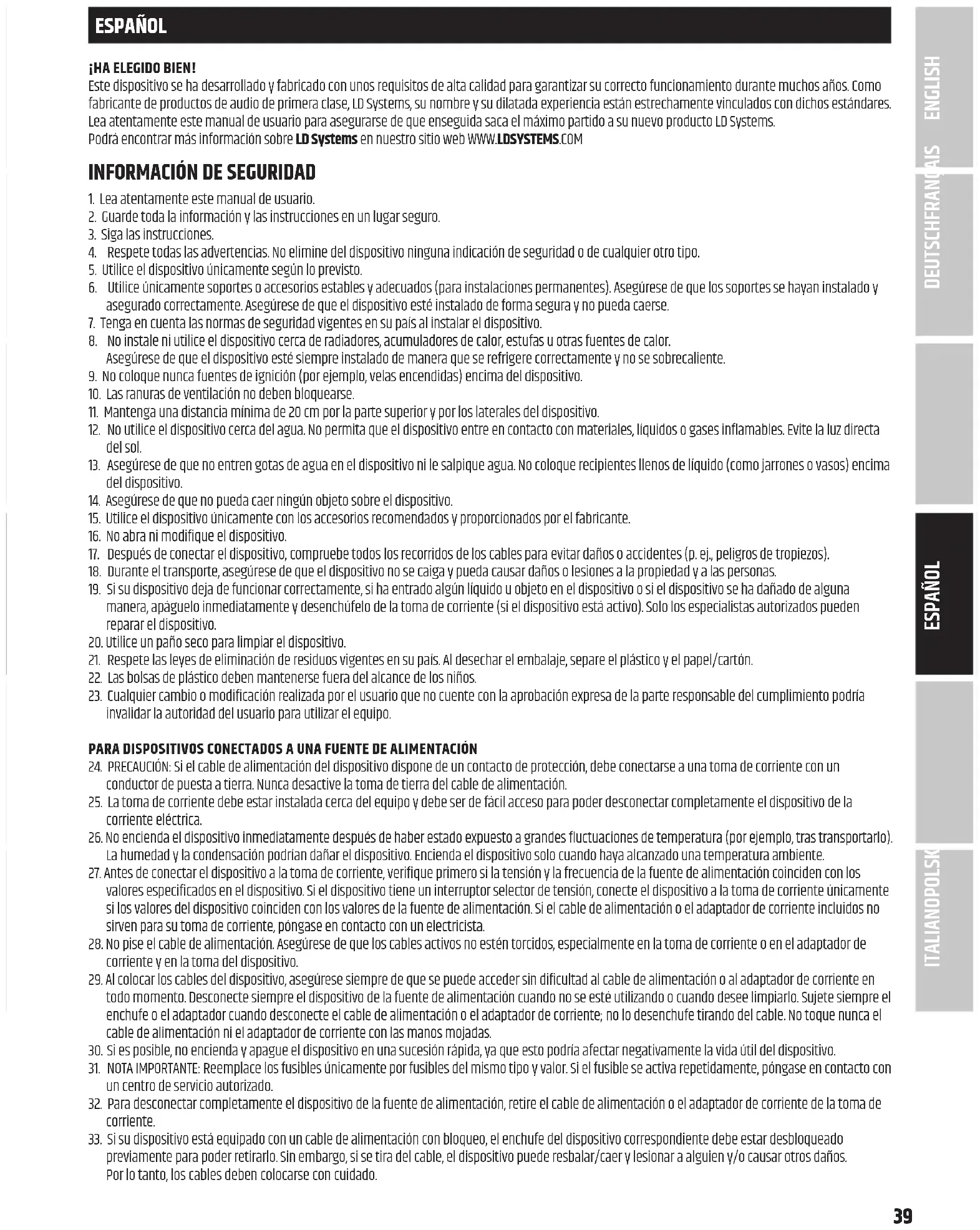 La sociétéAdamHallGmbH déclare par les présentes que cet équipement hertzien est conforme à la directive2014/53/EU. L’intégralité de la déclarationUE de conformité est disponible sur le siteInternet suivant: www.adamhall.com/compliance/ Le présent document peut contenir des erreurs d’impression ainsi que des fautes et peut faire l’objet de modifications, y compris techniques. ITALIANO POLSKI ESPAÑOL FRANÇAIS DEUTSCHENGLISH39 ESPAÑOL ¡HA ELEGIDO BIEN! Este dispositivo se ha desarrollado y fabricado con unos requisitos de alta calidad para garantizar su correcto funcionamiento durante muchos años. Como fabricante de productos de audio de primera clase, LD Systems, su nombre y su dilatada experiencia están estrechamente vinculados con dichos estándares. Lea atentamente este manual de usuario para asegurarse de que enseguida saca el máximo partido a su nuevo producto LD Systems. Podrá encontrar más información sobre LD Systems en nuestro sitio web WWW.LDSYSTEMS.COM