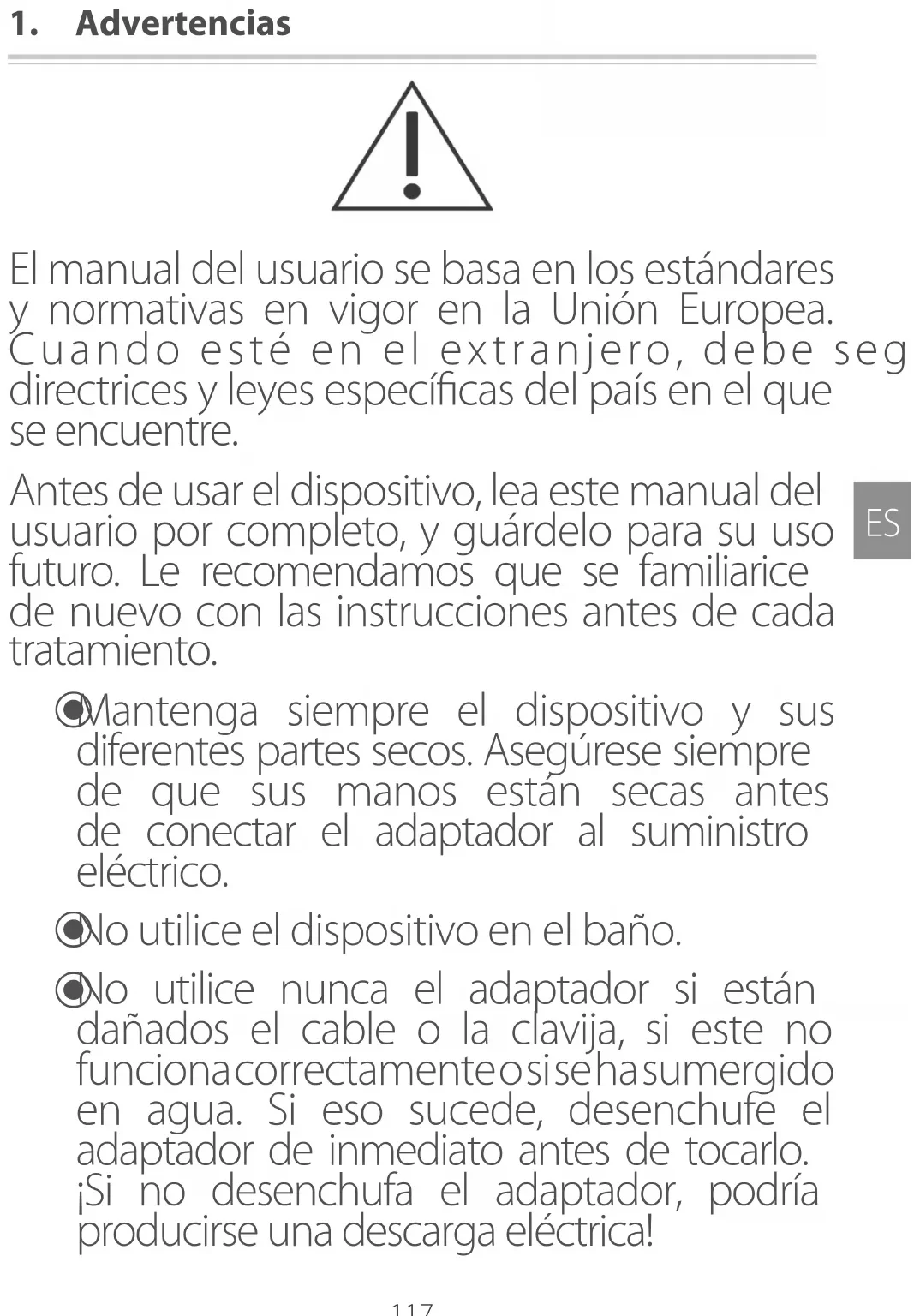 El manual del usuario se basa en los estándares y normativas en vigor en la Unión Europea. Cuando esté en el extranjero, debe seguir las directrices y leyes especícas del país en el que se encuentre. Antes de usar el dispositivo, lea este manual del usuario por completo, y guárdelo para su uso futuro. Le recomendamos que se familiarice de nuevo con las instrucciones antes de cada tratamiento.