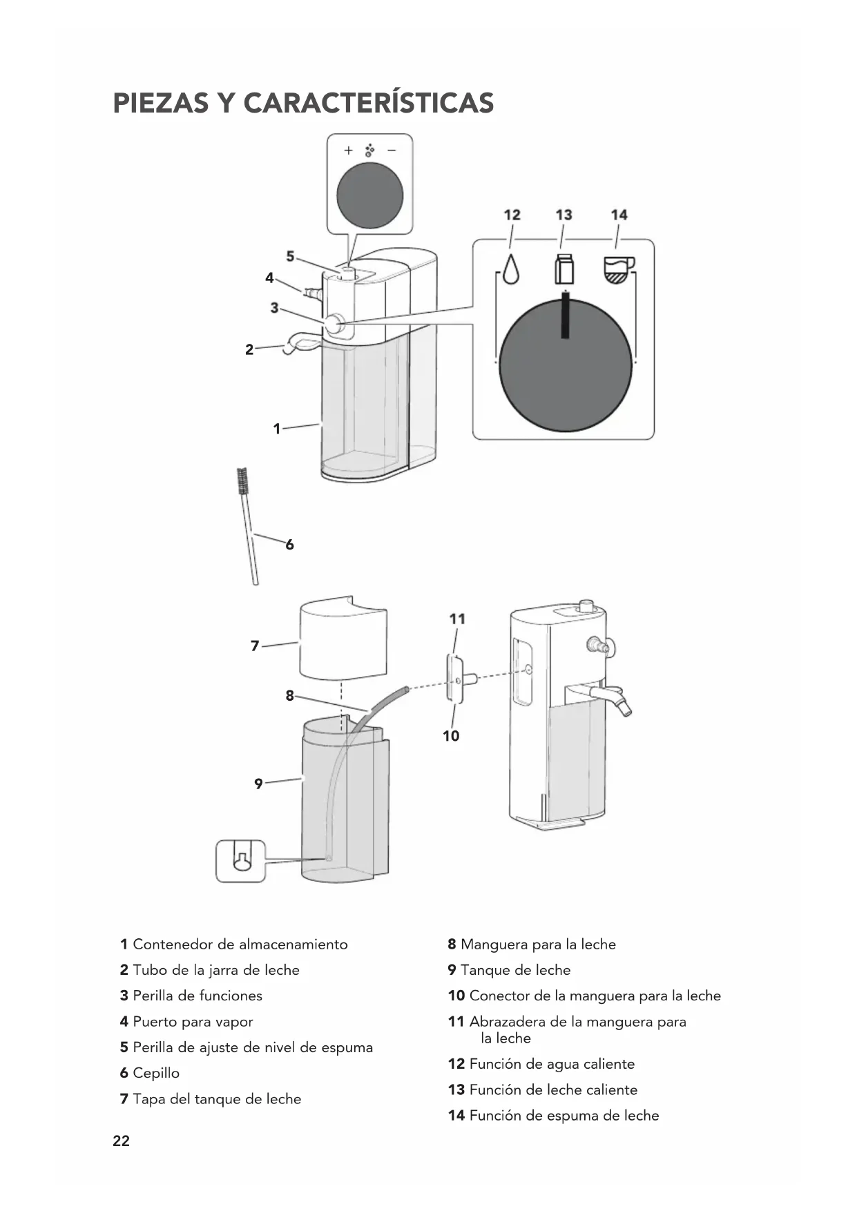 1 Contenedor de almacenamiento 2 Tubo de la jarra de leche 3 Perilla de funciones 4 Puerto para vapor 5 Perilla de ajuste de nivel de espuma 6 Cepillo 7 Tapa del tanque de leche 8 Manguera para la leche 9 Tanque de leche 10 Conector de la manguera para la leche 11 Abrazadera de la manguera para laleche 12 Función de agua caliente 13 Función de leche caliente 14 Función de espuma de leche
