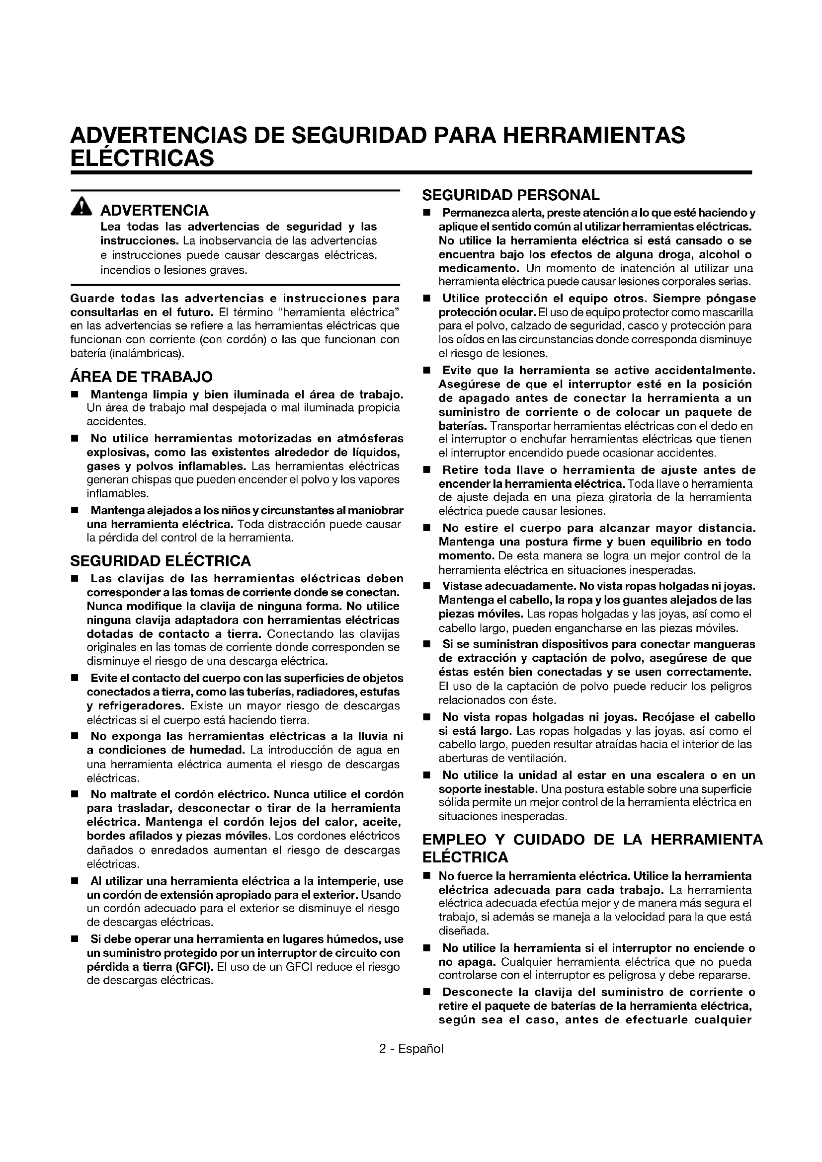 ELÉCTRICAS ADVERTENCIA Lea todas las advertencias de seguridad y las instrucciones. La inobservancia de las advertencias e instrucciones puede causar descargas eléctricas, incendios o lesiones graves. Guarde todas las advertencias e instrucciones para consultarlas en el futuro. El término “herramienta eléctrica” en las advertencias se refiere a las herramientas eléctricas que funcionan con corriente (con cordón) o las que funcionan con batería (inalámbricas).