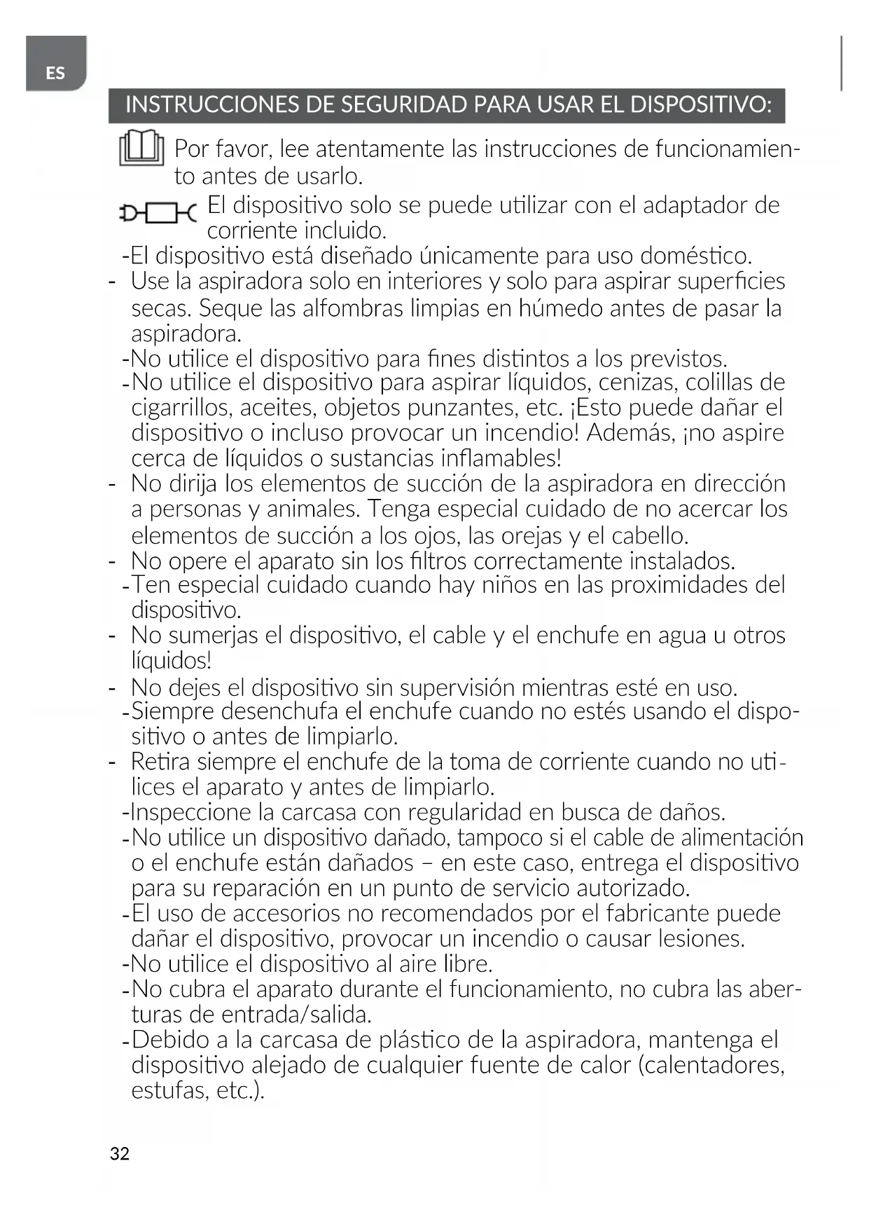 INSTRUCCIONES DE SEGURIDAD PARA USAR EL DISPOSITIVO: Por favor, lee atentamente las instrucciones de funcionamien- to antes de usarlo. El disposivo solo se puede ulizar con el adaptador de corriente incluido. - El disposivo está diseñado únicamente para uso domésco. - Use la aspiradora solo en interiores y solo para aspirar supercies secas. Seque las alfombras limpias en húmedo antes de pasar la aspiradora. - No ulice el disposivo para nes disntos a los previstos.