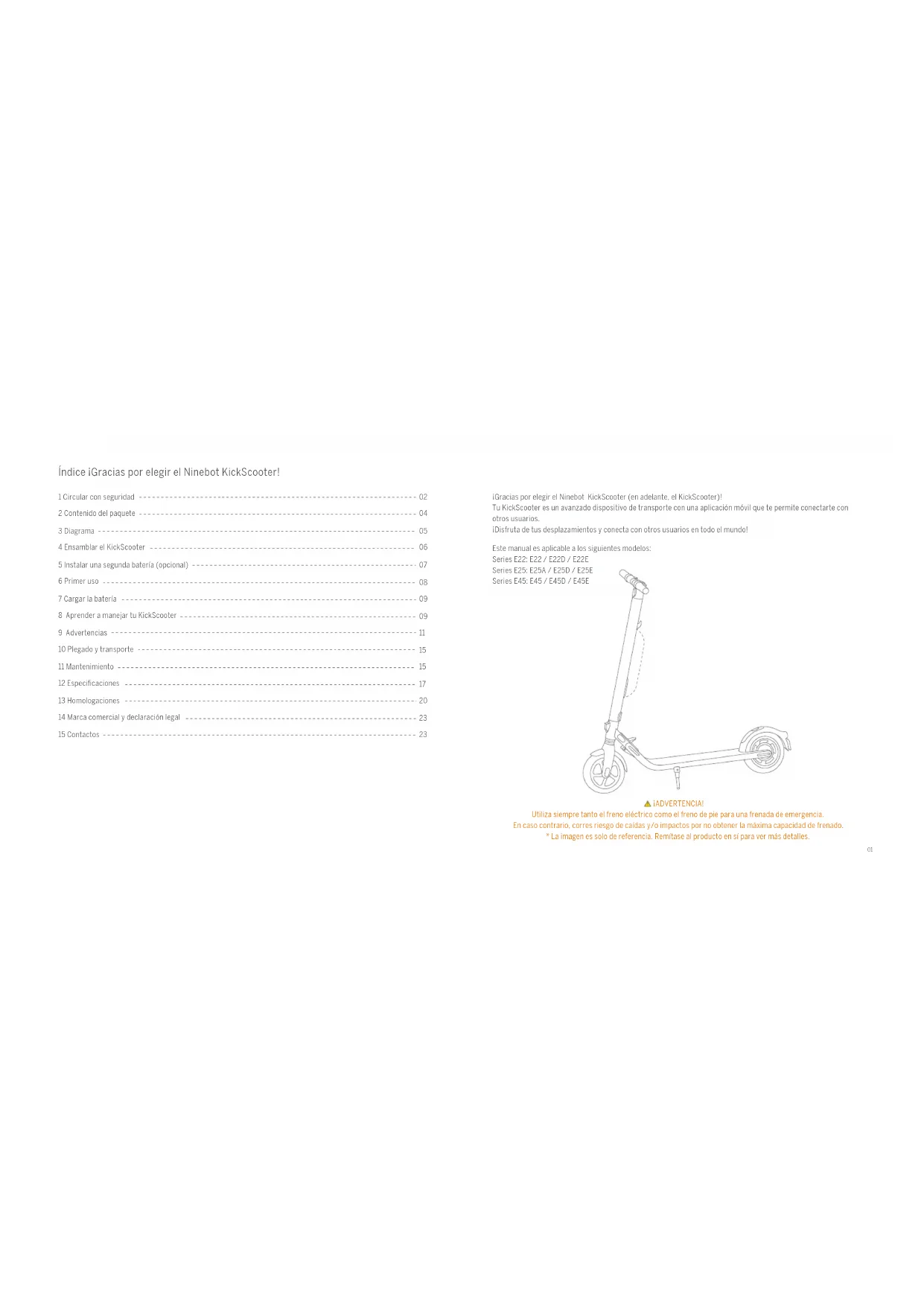 ¡Gracias por elegir el Ninebot KickScooter (en adelante, el KickScooter)!Tu KickScooter es un avanzado dispositivo de transporte con una aplicación móvil que te permite conectarte con otros usuarios.¡Disfruta de tus desplazamientos y conecta con otros usuarios en todo el mundo!Este manual es aplicable a los siguientes modelos:Series E22: E22 / E22D / E22ESeries E25: E25A / E25D / E25ESeries E45: E45 / E45D / E45E Índice ¡Gracias por elegir el Ninebot KickScooter! 4 Ensamblar el KickScooter5 Instalar una segunda batería (opcional)1 Circular con seguridad2 Contenido del paquete3 Diagrama6 Primer uso7 Cargar la batería8 Aprender a manejar tu KickScooter9 Advertencias11 Mantenimiento13 Homologaciones12 Especificaciones10 Plegado y transporte14 Marca comercial y declaración legal15 Contactos