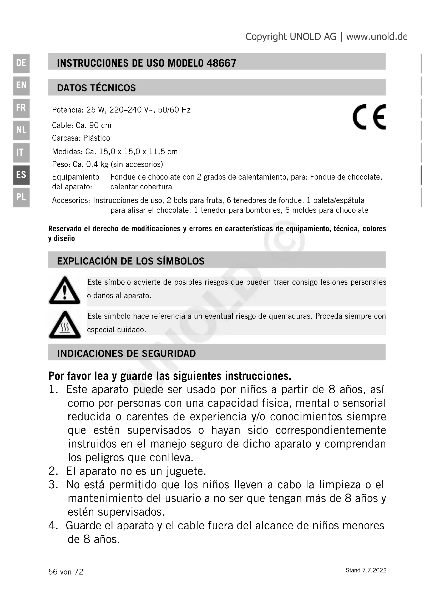 Este símbolo advierte de posibles riesgos que pueden traer consigo lesiones personales o daños al aparato. Este símbolo hace referencia a un eventual riesgo de quemaduras. Proceda siempre con especial cuidado. UNOLD © Copyright UNOLD AG | www.unold.deStand 7.7.2022 57 von 72