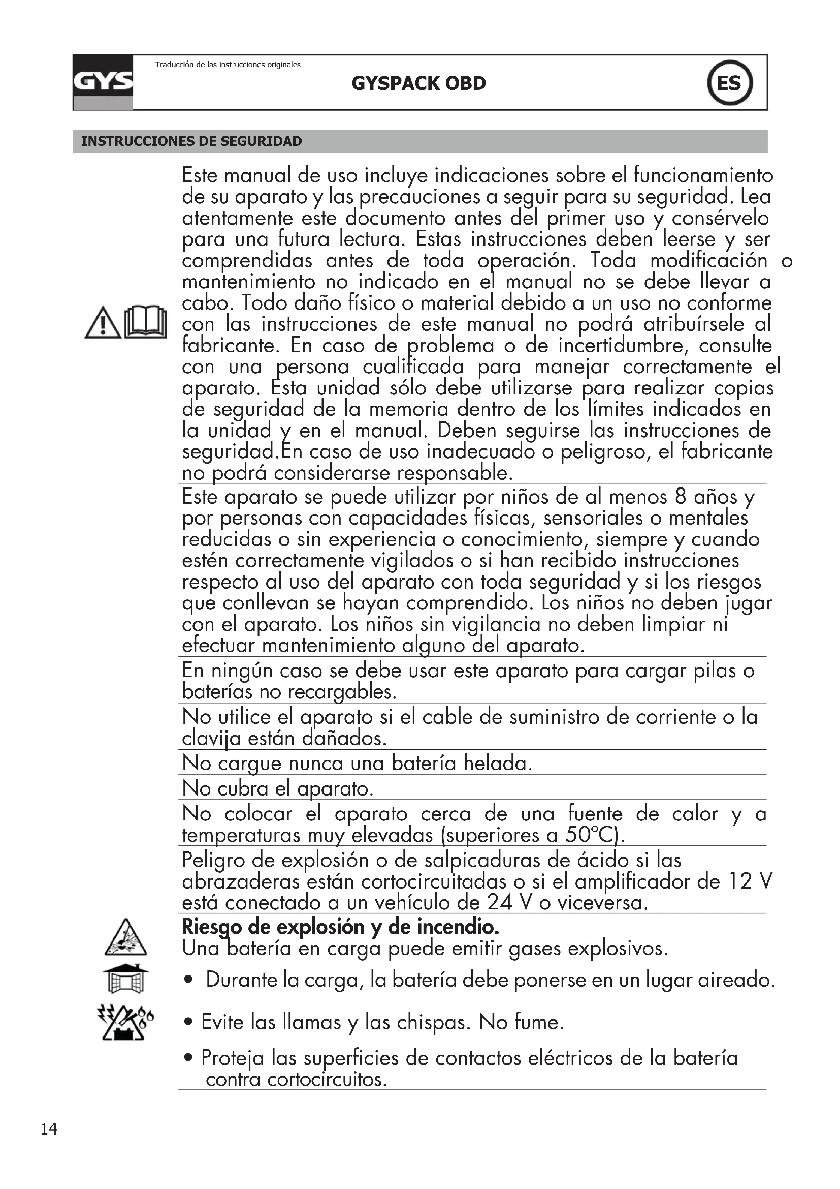 Este manual de uso incluye indicaciones sobre el funcionamiento de su aparato y las precauciones a seguir para su seguridad. Lea atentamente este documento antes del primer uso y consérvelo para una futura lectura. Estas instrucciones deben leerse y ser comprendidas antes de toda operación. Toda modicación o mantenimiento no indicado en el manual no se debe llevar a cabo. Todo daño físico o material debido a un uso no conforme con las instrucciones de este manual no podrá atribuírsele al fabricante. En caso de problema o de incertidumbre, consulte con una persona cualicada para manejar correctamente el aparato. Esta unidad sólo debe utilizarse para realizar copias de seguridad de la memoria dentro de los límites indicados en la unidad y en el manual. Deben seguirse las instrucciones de seguridad.En caso de uso inadecuado o peligroso, el fabricante no podrá considerarse responsable. Este aparato se puede utilizar por niños de al menos 8 años y por personas con capacidades físicas, sensoriales o mentales reducidas o sin experiencia o conocimiento, siempre y cuando estén correctamente vigilados o si han recibido instrucciones respecto al uso del aparato con toda seguridad y si los riesgos que conllevan se hayan comprendido. Los niños no deben jugar con el aparato. Los niños sin vigilancia no deben limpiar ni efectuar mantenimiento alguno del aparato. En ningún caso se debe usar este aparato para cargar pilas o baterías no recargables. No utilice el aparato si el cable de suministro de corriente o la clavija están dañados. No cargue nunca una batería helada. No cubra el aparato. No colocar el aparato cerca de una fuente de calor y a temperaturas muy elevadas (superiores a 50ºC). Peligro de explosión o de salpicaduras de ácido si las abrazaderas están cortocircuitadas o si el amplicador de 12 V está conectado a un vehículo de 24 V o viceversa. Riesgo de explosión y de incendio. Una batería en carga puede emitir gases explosivos.